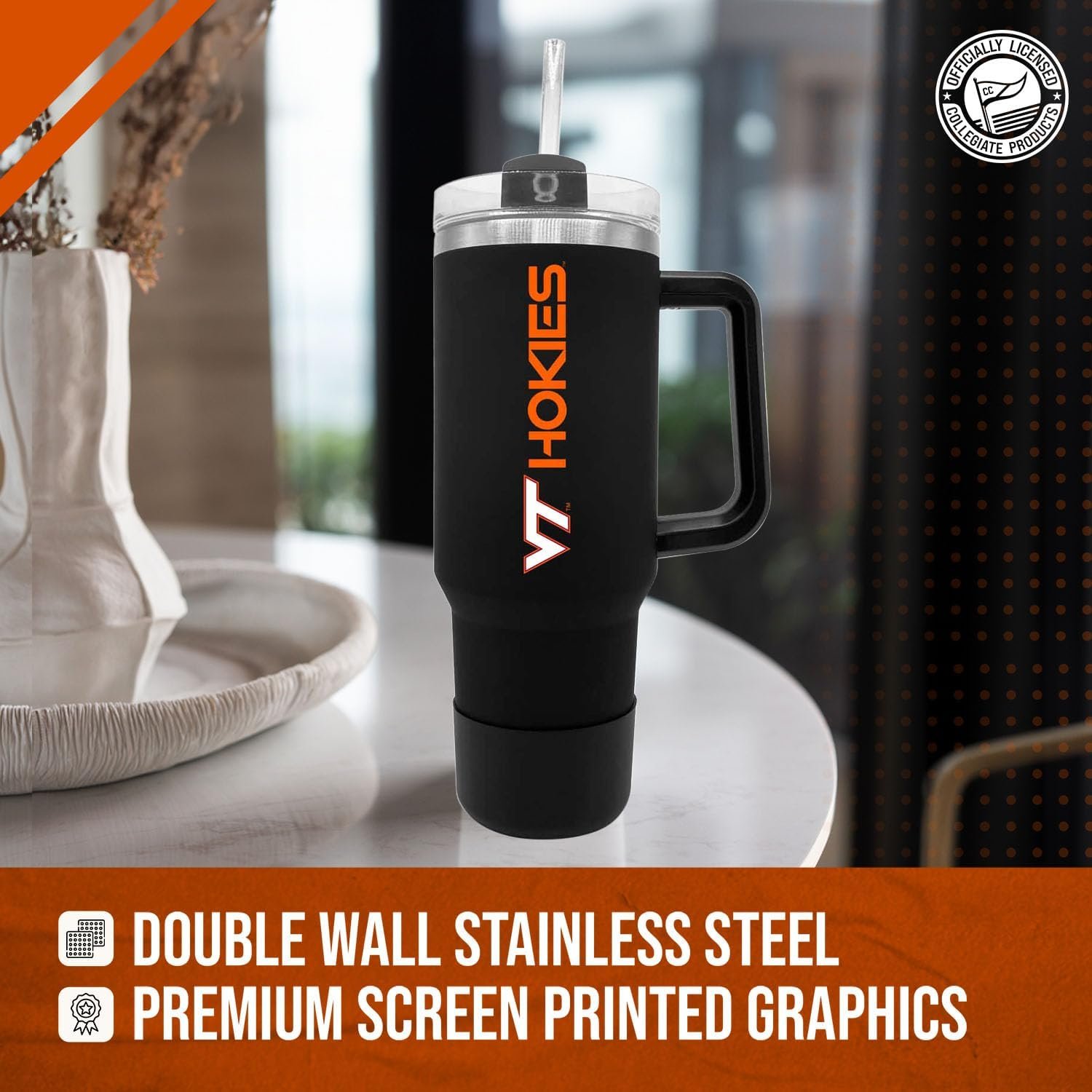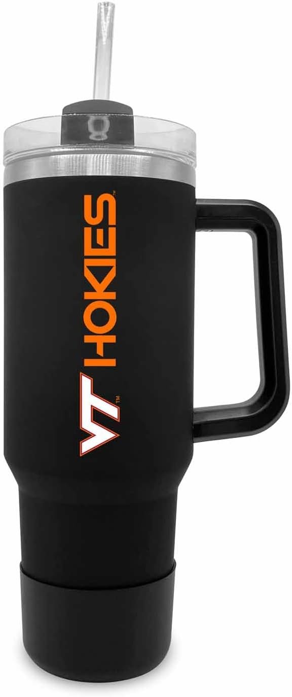 SHOW OFF YOUR TEAM PRIDE: with our 40 oz travel tumbler with handle and straw! These digitally printed, soft-touch 40 oz tumbler come with a dual option screw on lid & straw making it the perfect cup to use as a hot coffee tumbler or cold water bottle; an essential for those who want to show support for their Virginia Tech Hokies; 40 oz, stainless steel body; BPA-free