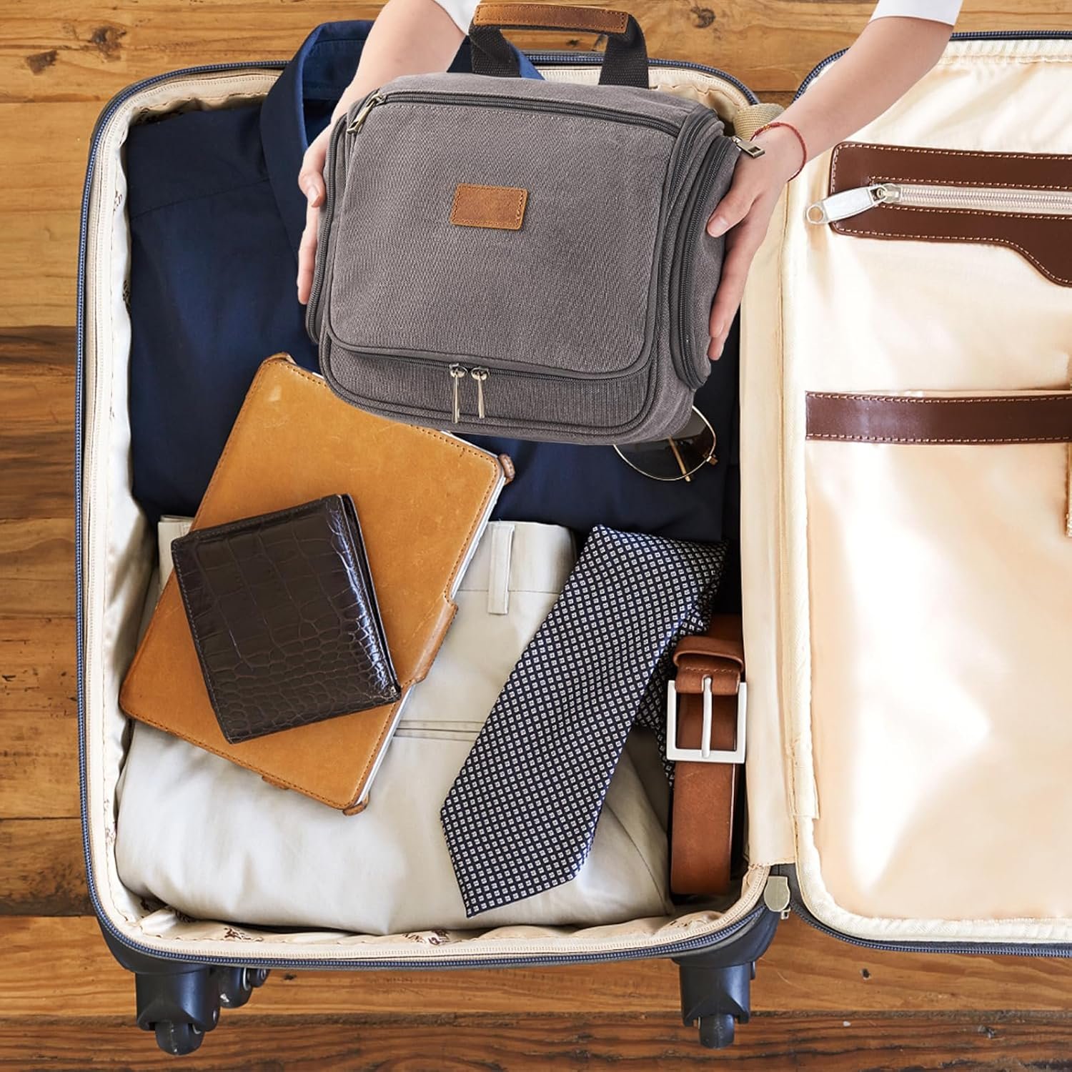 Canvas Toiletry Bag for Men Shaving Dopp Kit Bulk Travel Hanging Makeup Organizer with Sturdy Metal Hook Portable Cosmetic Bag for Women with Large Capacity Grey