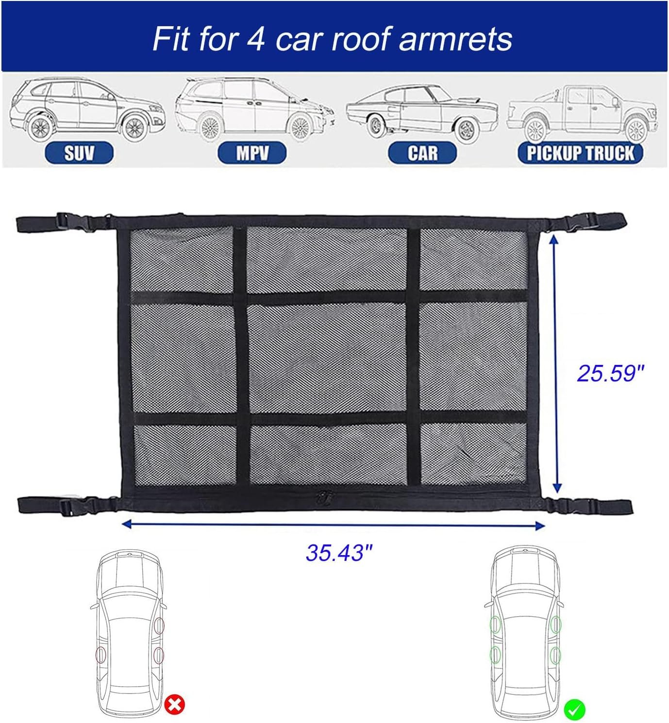 đ ăSuitable for most vehicles ăCar roof storage bag can be installed in most cars with four handlebars such as SUV, Van . The size is 35.43″*25.59″. The buckle is adjustable, you can adjust the height of the ceiling storage net.