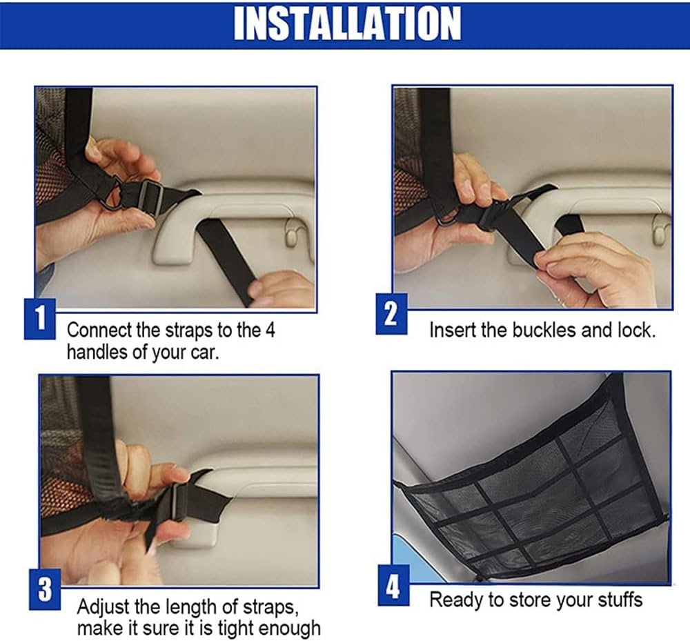 Lengthened Fixed Rope & Suitable for Most Vehicle】 The fixing rope of the car roof storage organizer is lengthened to 25.98inch/66CM,size is 31.5 x 21.6 inches,it is suitable for ceiling net storage of 4 handles such as cars,Jeep,SUVs,and so on.Making it ideal for long-distance travel and camping.