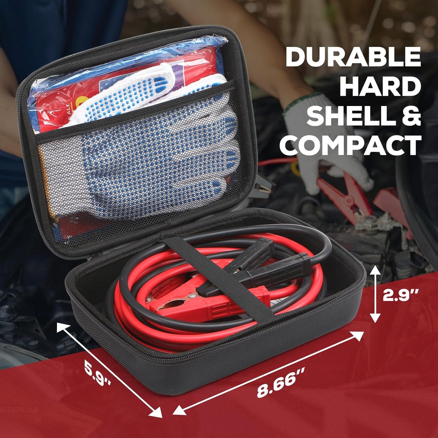 【Stay Safe On The Road】Be prepared with this compact,practical emergency roadside kit for car,including Jumper Cables,Safety Hammer,Tire Pressure Gauge, Safety Gloves, Mechanical Flashlight,Screwdriver,Rain Coat,PVC Tape,Voltage Tester,Whistle and Multi-function tool card so you can quickly and confidently get back on the road.