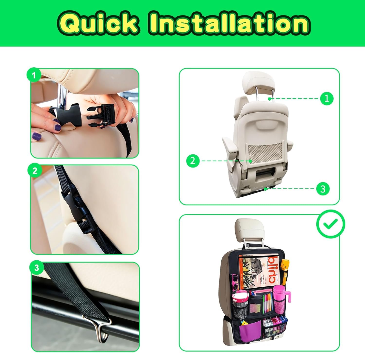 Car Backseat Organizers: there are new added pockets to store baby supply like bottle, toy, snack, drink, etc, keep those accessories away from floorboard, cars interior stay neat and tidy, no more clutter