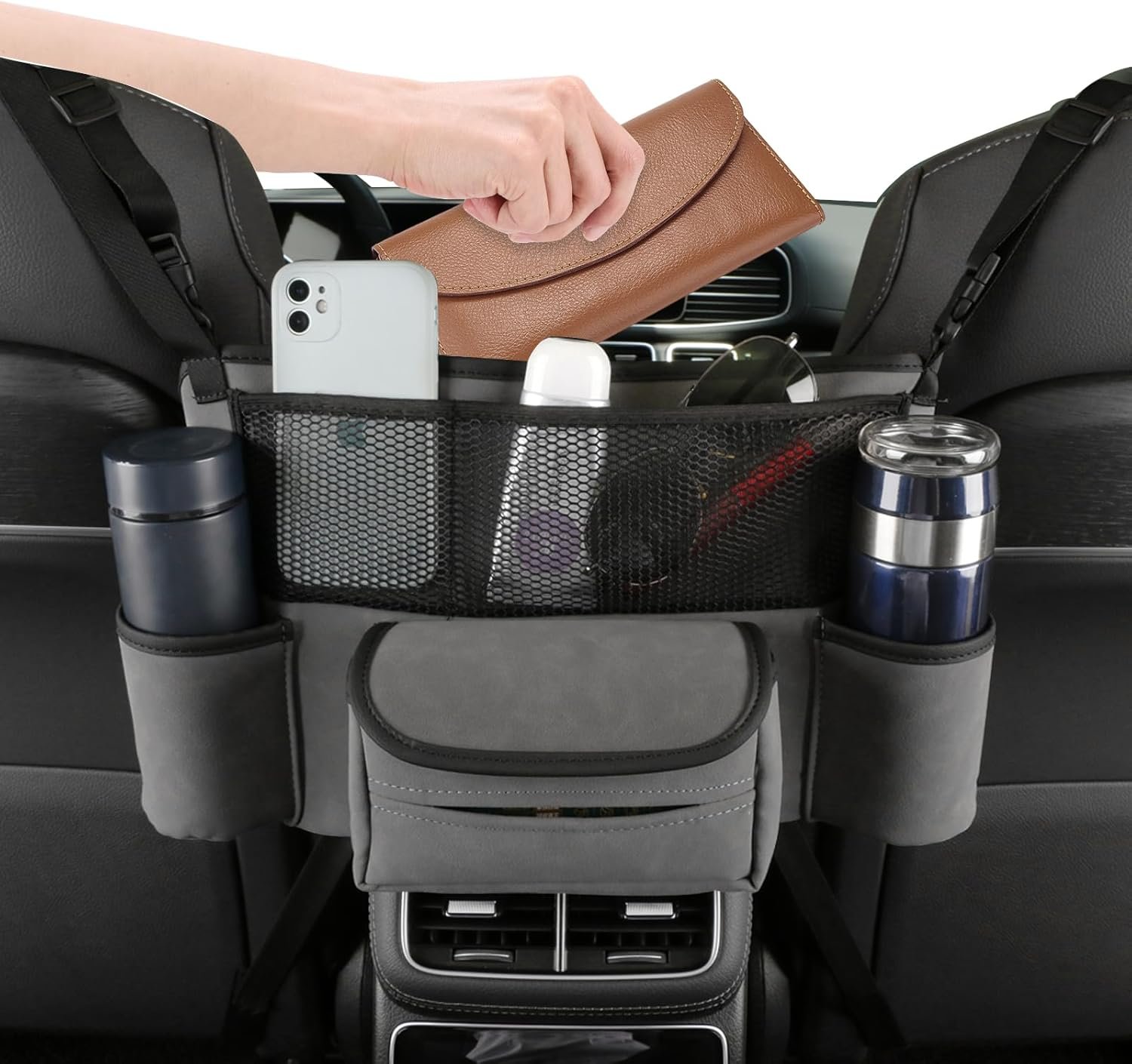 Car Organizers and Storage with Cup Holders & Tissue Holder, Purse Holder for Car Between Front Seats.(Grey)