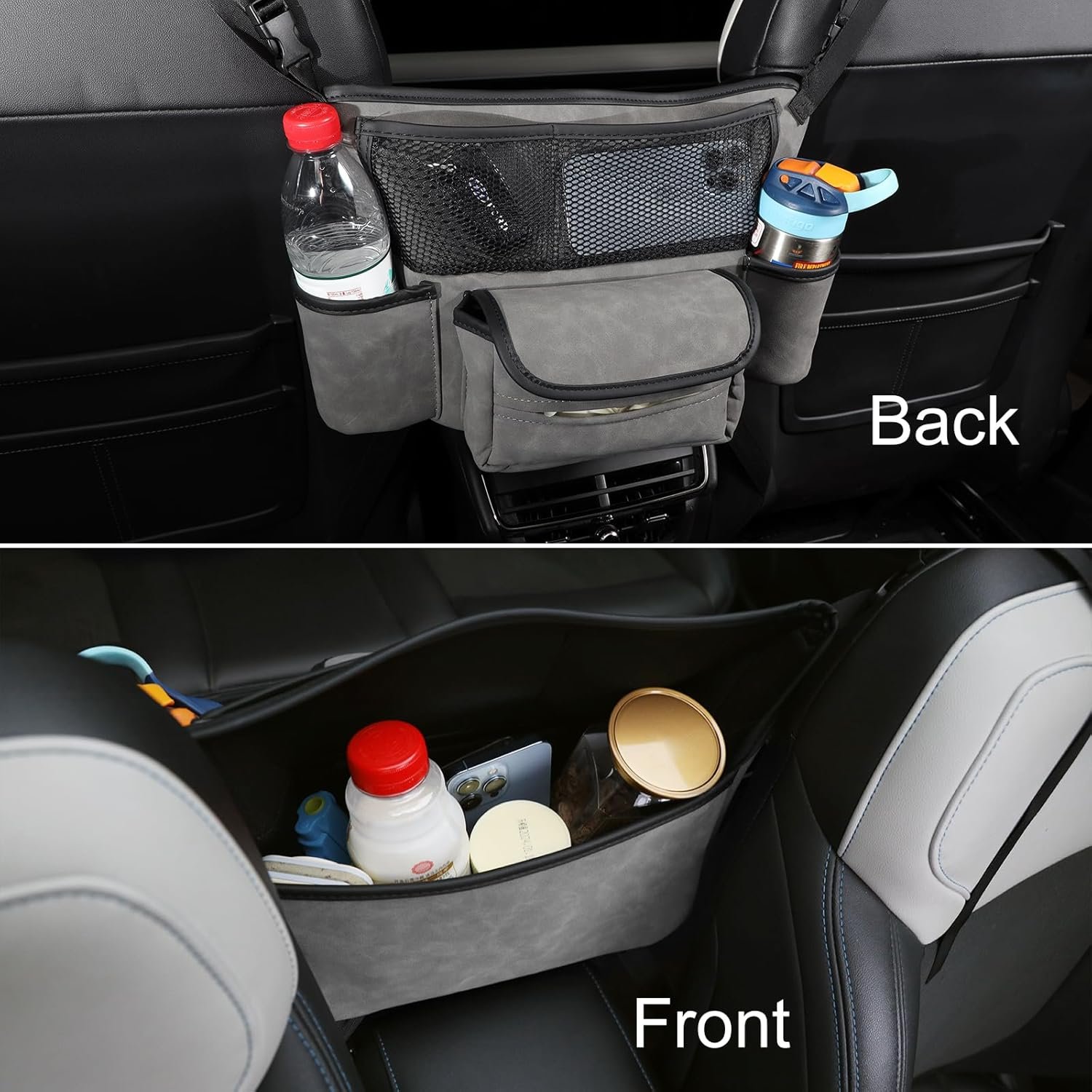 2.Keep your purse, phone, tablet, water bottles, and essentials organized while driving. The built-in dividers ensure stability, preventing items from falling or sliding around. The added tissue pocket and cup holders offer extra convenience.