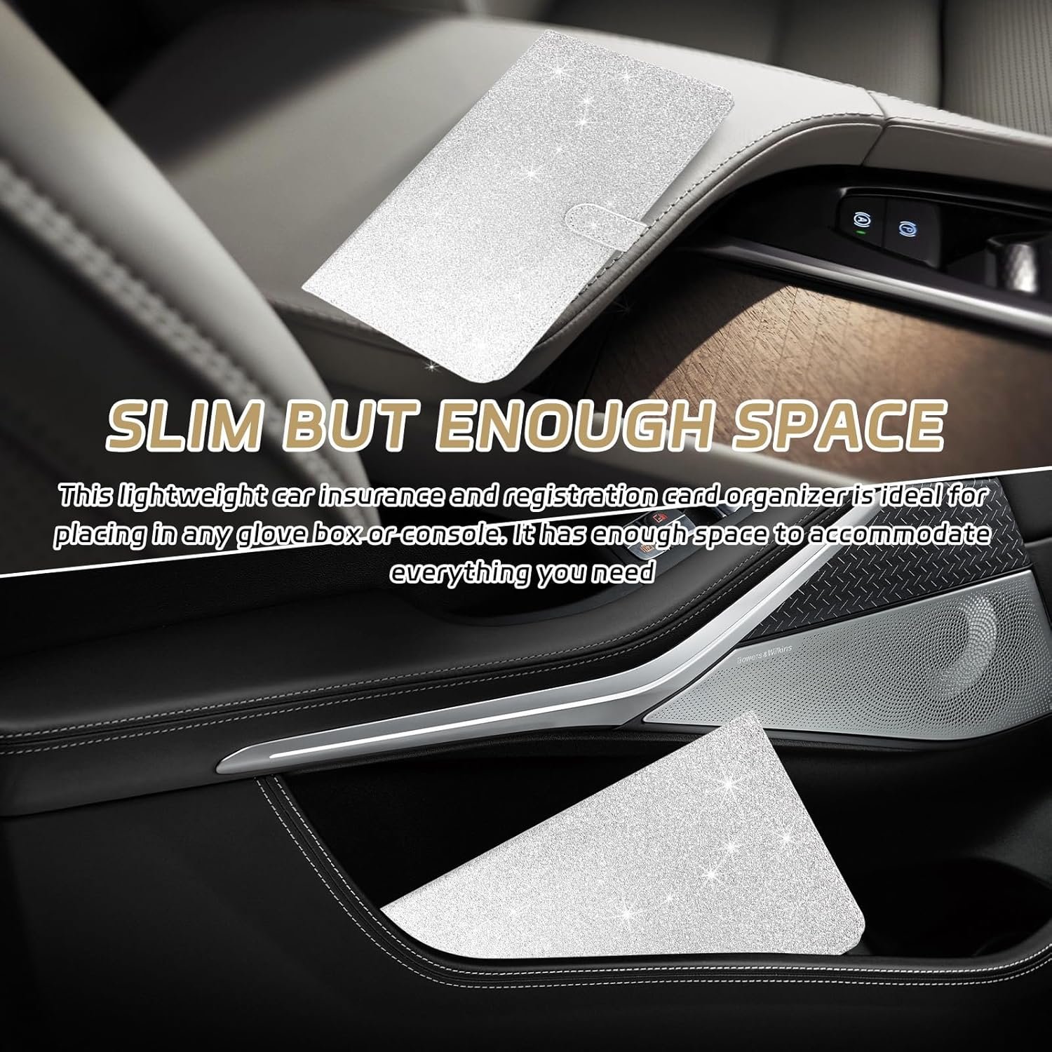Car Registration and Insurance Holder, Leather Car Document Holder with Magnetic Shut, Universal Car Organizer for Cards License Documents, Interior Car Accessories (Glitter Silver)