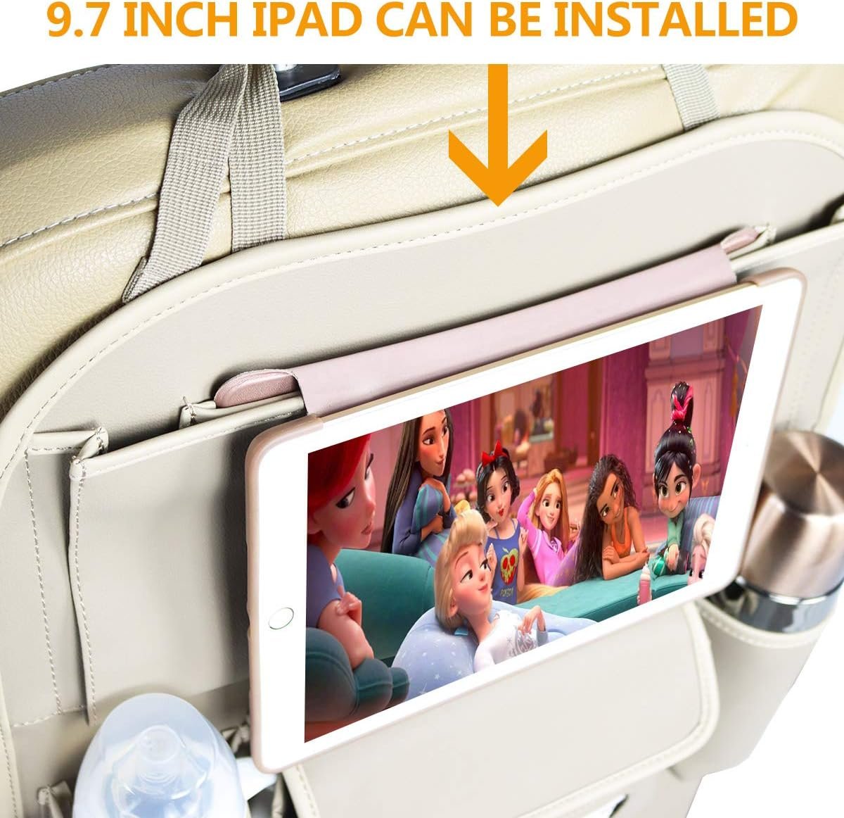 Special Design, Large Capacity: with 1 pocket for iPad, 2 bottle holders, 2 hooks, 1 tissue box, 1 large storage box, car seat protector is large ans its size is about 17.0 x 23.3in, suitable for all kinds of carseat with a headrest
