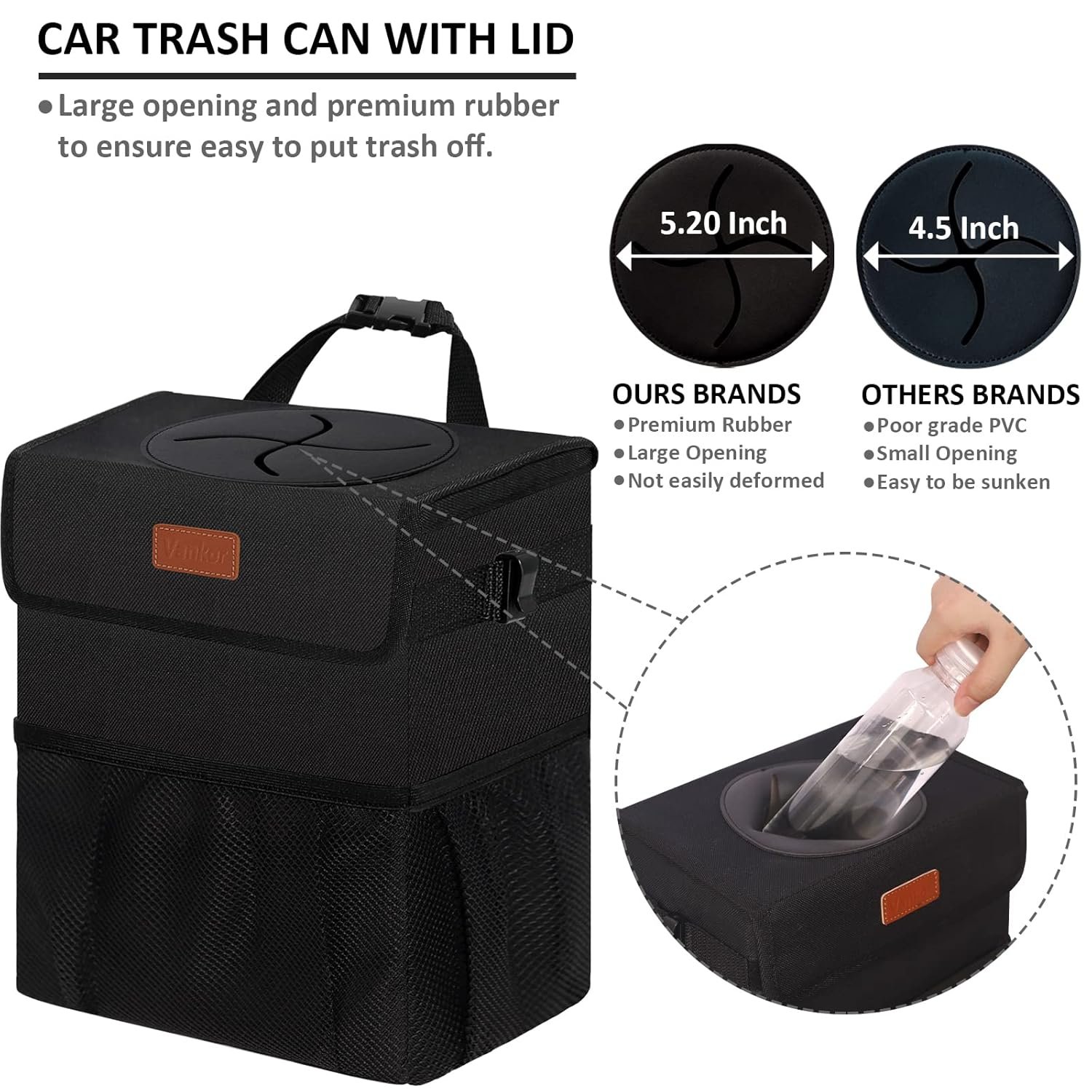 Intimate Design& Capacity: There are 2 side clasps for fixing disposable bags, effectively preventing falling out; Vankor car trash bags have about 2.2 and 3.0 Gallons for storage of car garbage or other stuff; Car trash bin has 100% leak-proof PEVA thick lining, no spillages will happen and is easy to be cleaned; The extra-large opening is made of elastic soft rubber, very roomy and easier to put litter into the bag, and helps to keep trash from spilling