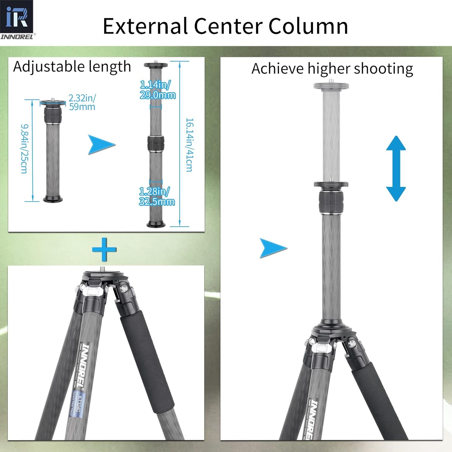 【2-SECTION ADJUSTABLE CENTER COLUMN】There is an external 2-section adjustable central column coming with the tirpod,after installing it, you can get an extra height of 16.14in/41cm, which can achieve higher shooting and match most photographer’s need of shooting height.