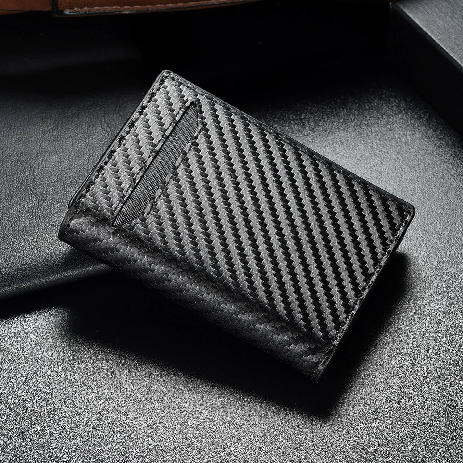Premium Leather Wallet: Handcrafted from premium leather and durable aluminum smart pop up wallet. The high-quality leather or carbon fiber ensure a comfortable touch and a sturdy build, with a guarantee of years of use without wear or peeling.