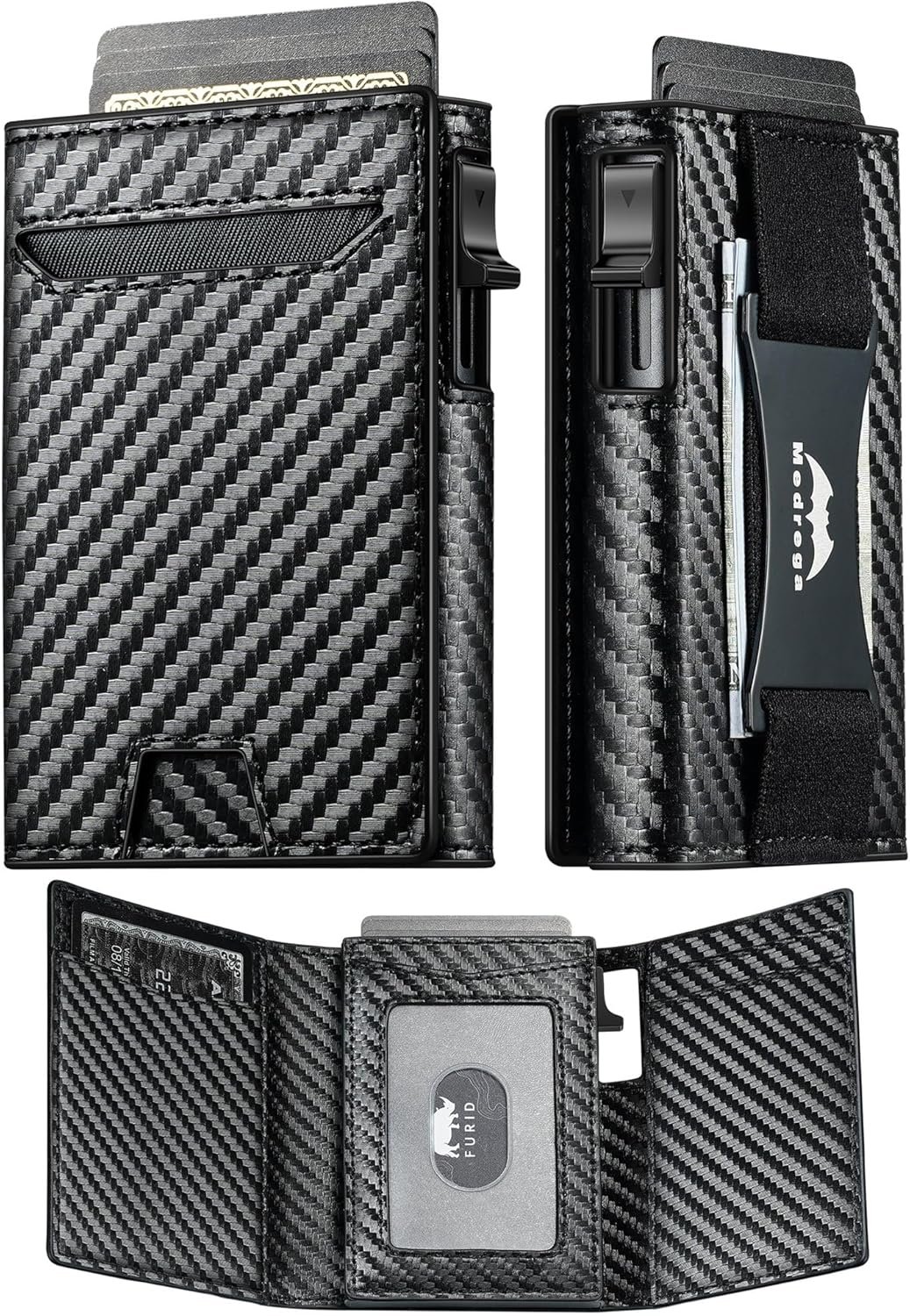 Quick Access with Large Capacity: Easy access your most-used cards with the smart pop up wallet designed for speed and convenience. At the flick of a switch, the durable aluminum card holder ejects 6-7 cards in a tiered fashion, making selection easy. With space for up to 11 cards, cash strap for cash or bills, front pocket, and a visible ID window.
