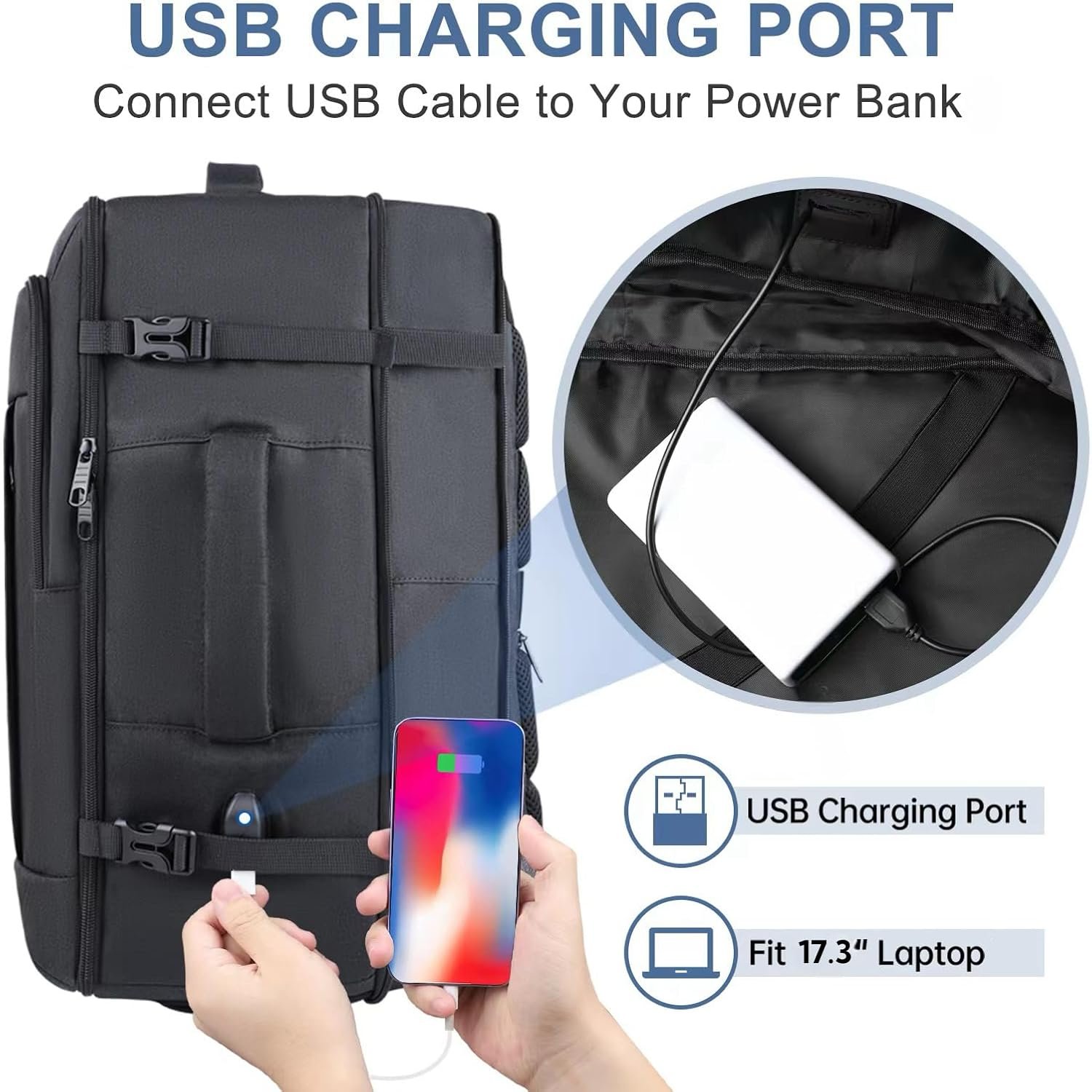Usb Charging Port: The travel backpack features a built-in USB charger outside and a charging cable inside, providing a convenient way to charge your phone while walking. It is important to note that the backpack does not include a power bank and does not power itself. The USB charging port is designed solely for charging purposes. With this added convenience, the backpack offers a practical solution for people who are frequently on-the-go and need to keep their electronic devices charged.