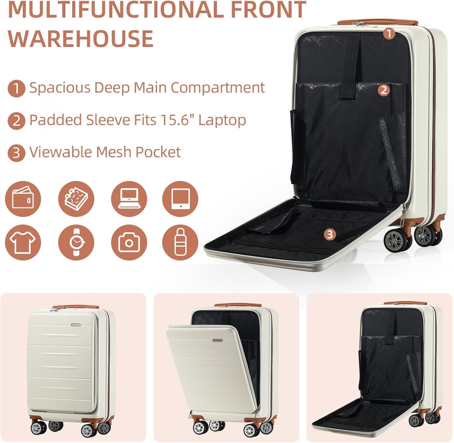 【Easy Open Side Compartment】The 20-inch carry-on bag is designed with an extra front pocket for quick storage of items such as electronic devices, hoodies or passports, making it easy to pull much-needed items out of the suitcase