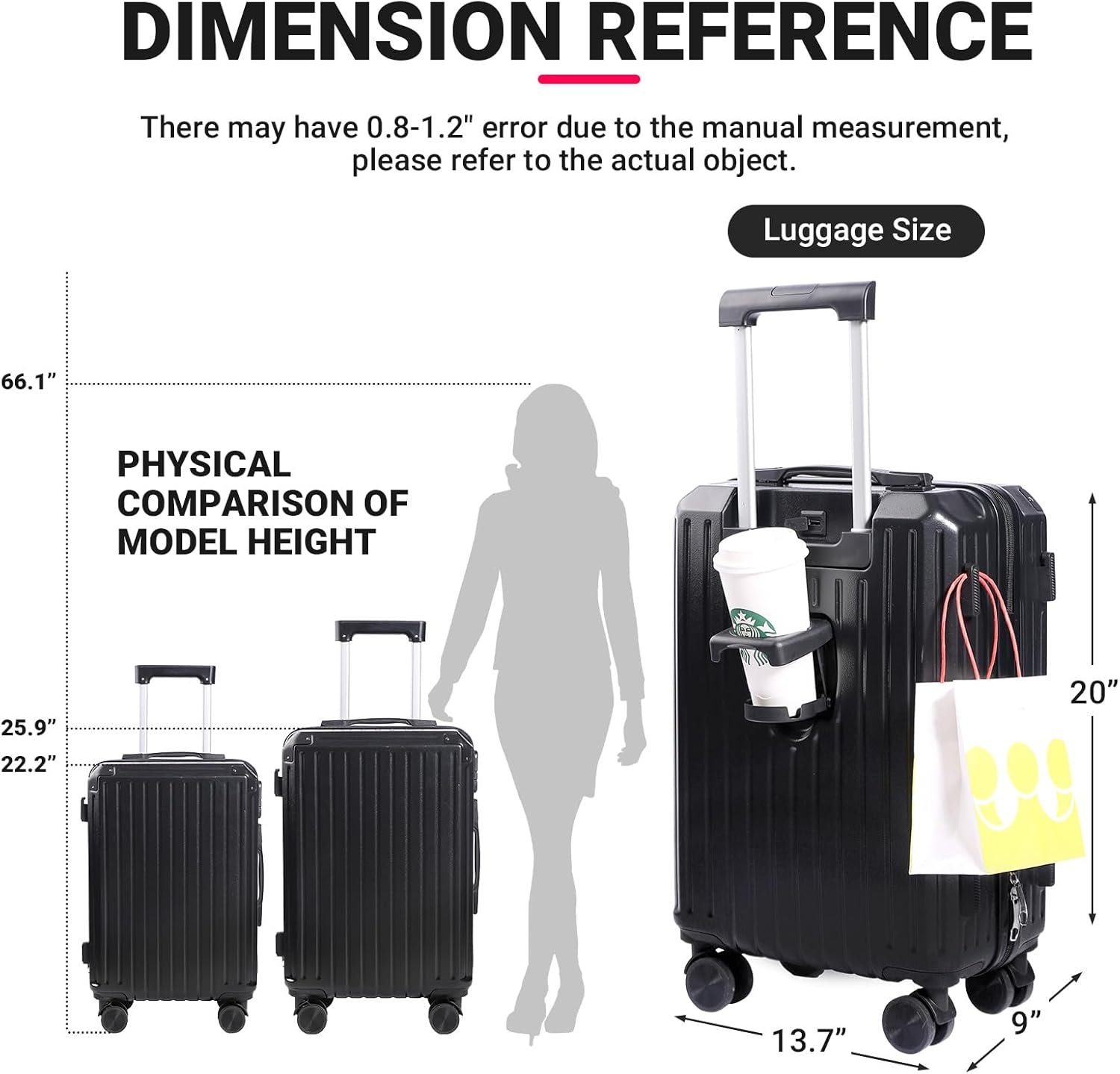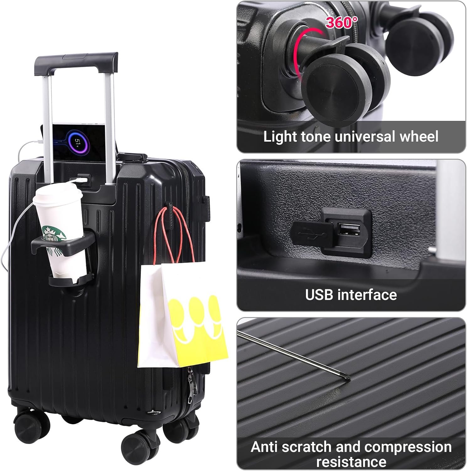Carry-on Luggage with Cup Holder & USB Charging Port, Hard Side Luggage with Spinner Wheels, Lightweight Luggage for Travel, Business (Black, Carry-On 20-Inch)