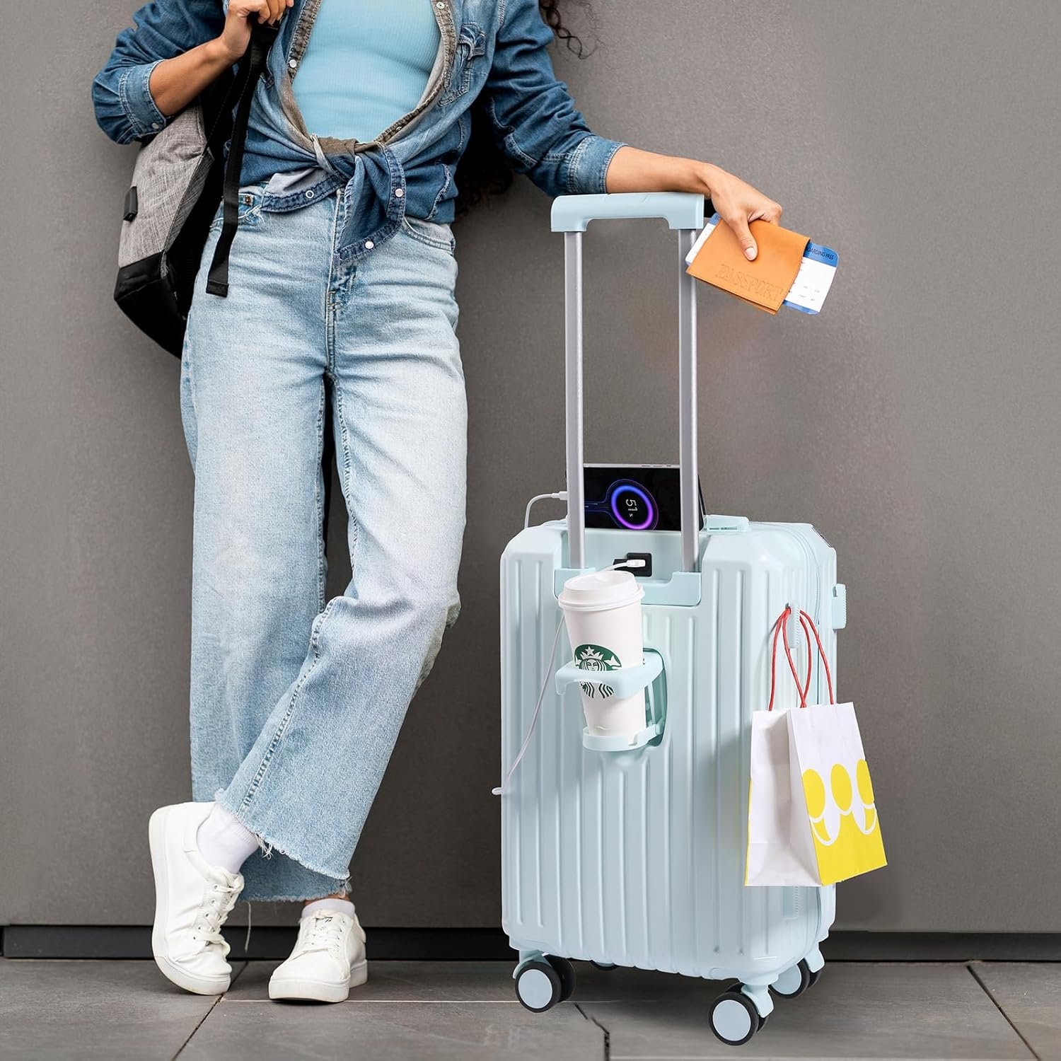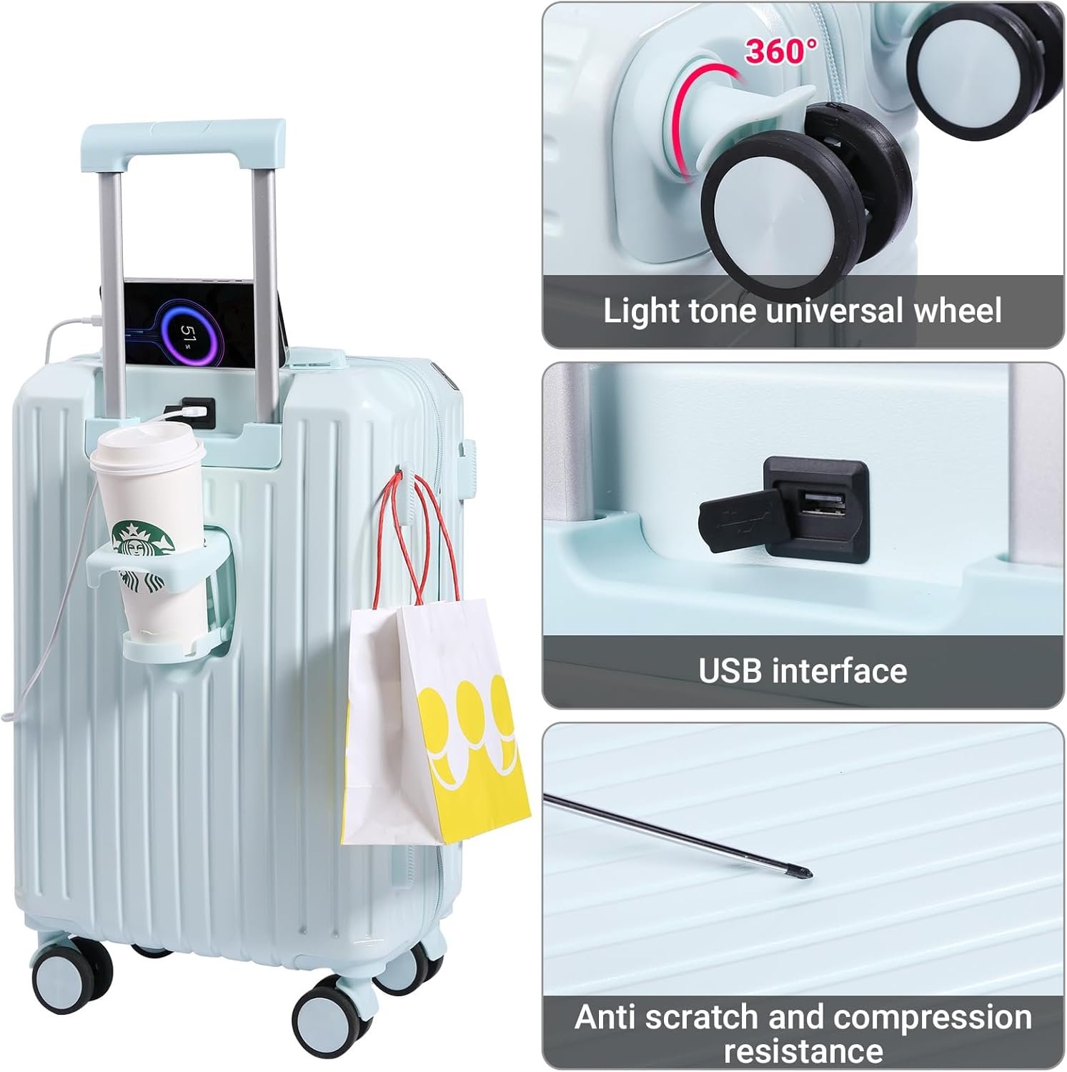 Carry-on Luggage with Cup Holder & USB Charging Port, Hard Side Luggage with Spinner Wheels, Lightweight Luggage for Travel, Business (Blue, Carry-On 20-Inch)