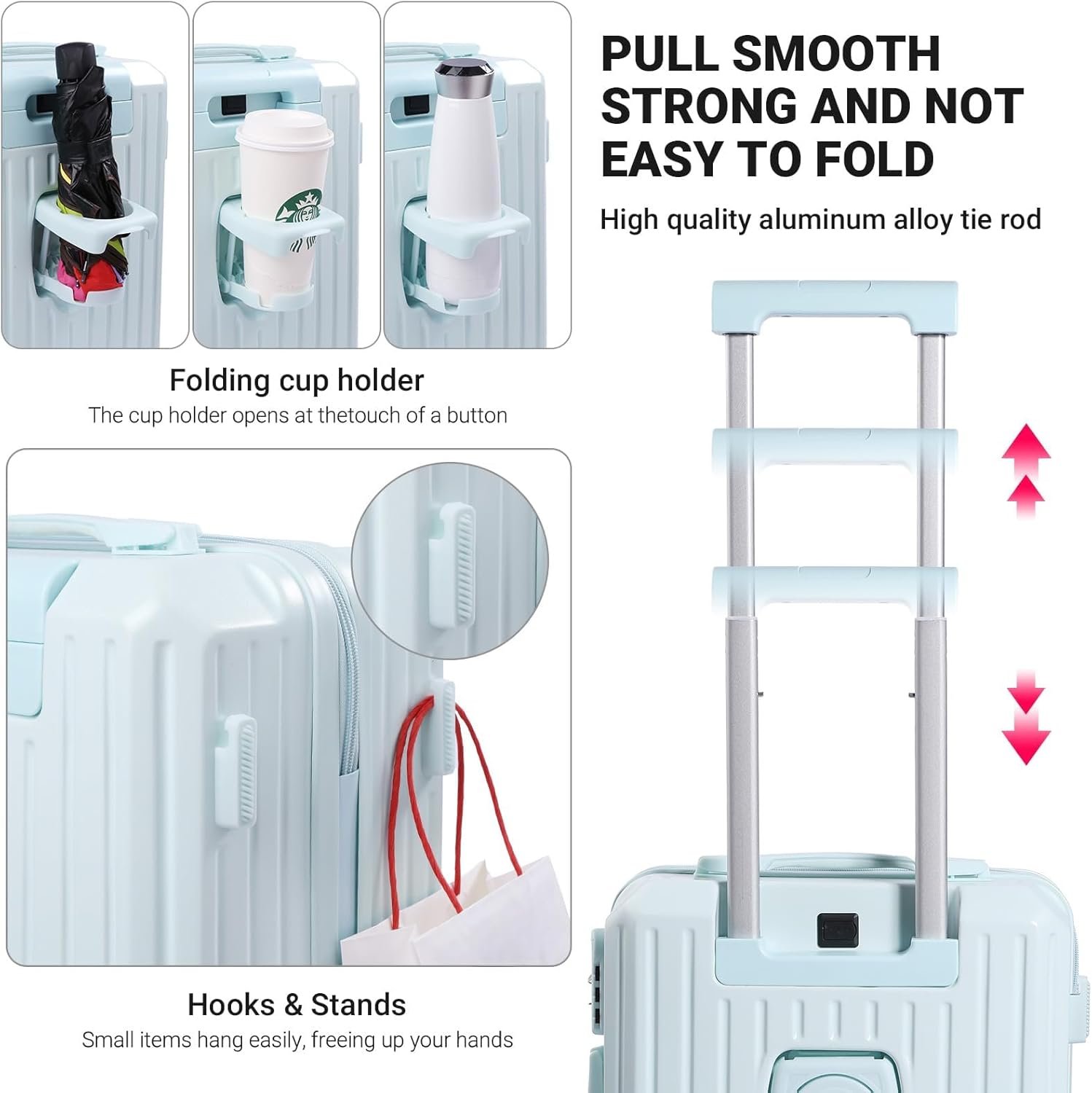 ADJUSTABLE: The telescopic handle can be adjusted to different heights to suit people of different heights, ensuring a comfortable and seamless pulling experience, as well as a stable and smooth stowage, making it a versatile and user-friendly travelling companion.