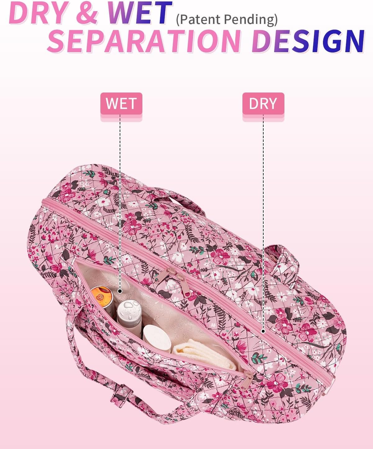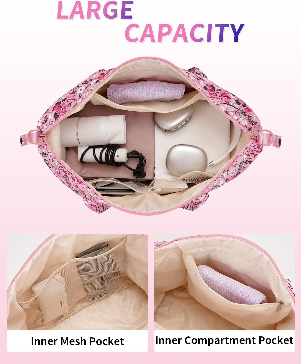【MULTIPLE POCKETS】A front zipper pocket. The main compartment of the travel tote bag includes two mesh pockets and an internal divider pocket, providing enhanced organization capabilities. Additionally, there are two side pockets designed to hold items such as water bottles and umbrellas securely.