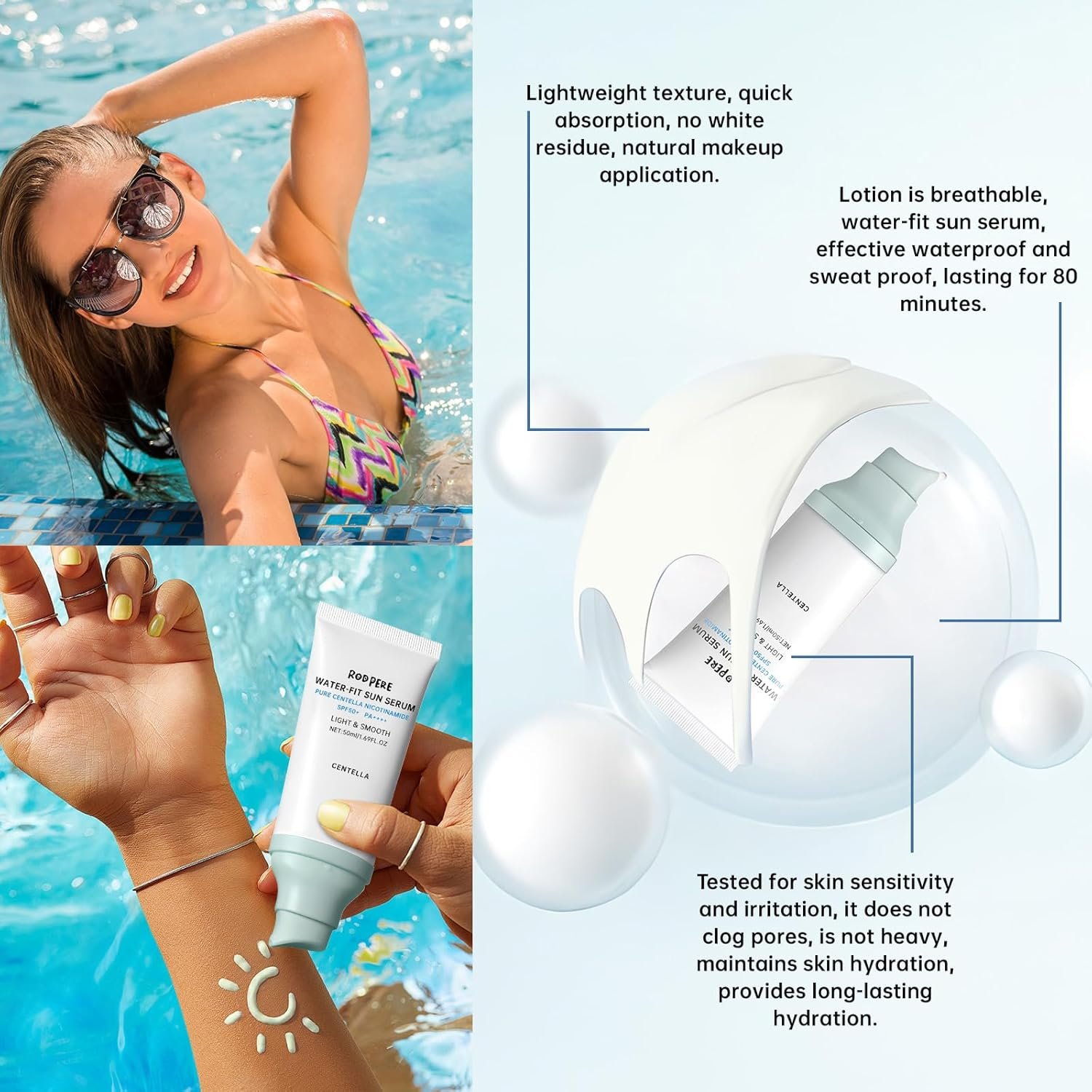 LONG-LASTING MOISTURIZING SUN SCREEN: Sunscreen not only focuses on sun care, but also focuses on repairing. Centella, hyaluronic acid and glycerin help you soothe aging and peeling skin in the sun, provide long-lasting moisturizing, restore skin firmness and elasticity, improve skin texture, provide all-round care for the skin