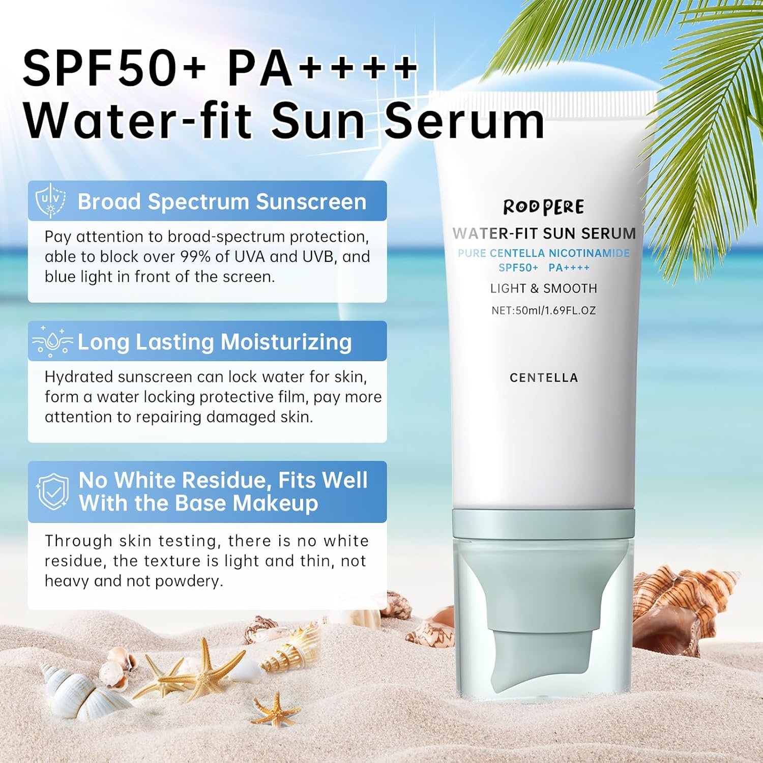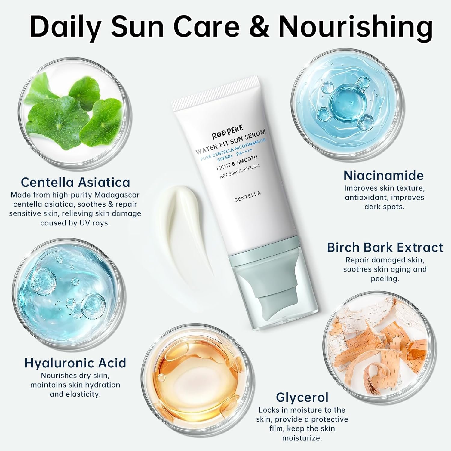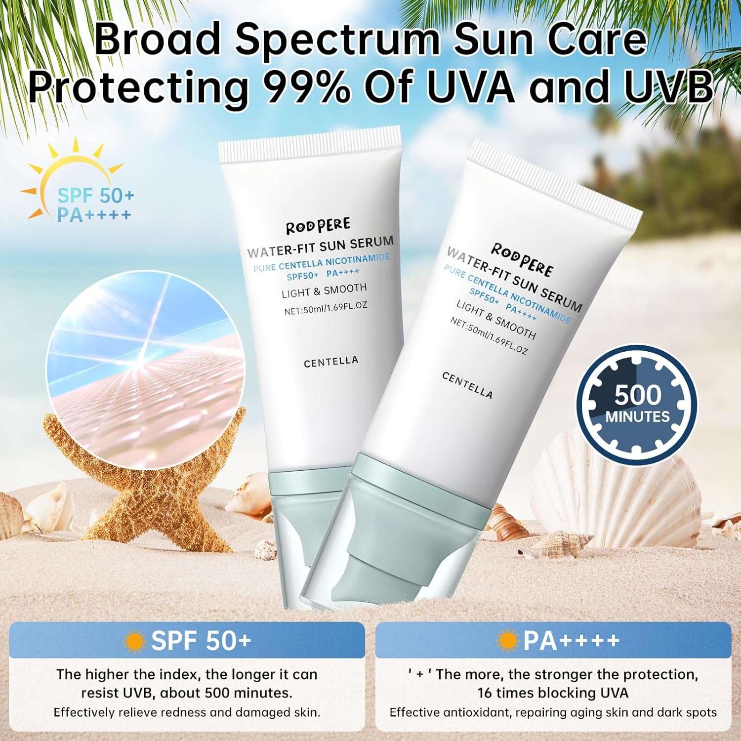 SPF 50+ SUN SERUM: Sun serum maintains the soothing and repairing effect of centella asiatica, meets the high-efficiency UV protection of broad-spectrum SPF 50+ PA++++, reduces the irritation of the sunlight to the skin, relieves skin damage and aging, provides all-weather protection, builds a skin protection barrier