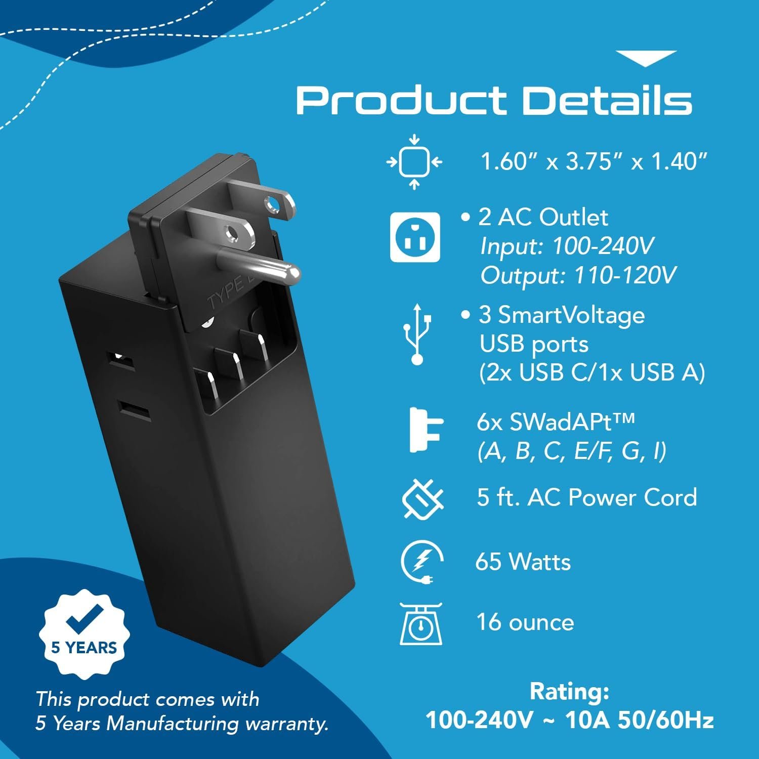 5 in 1 POWER STRIP – 1 USB inputs + 2 USB-C Input is more than you need from this ultra compact smallest most powerful 65W Charger. 2 USA Outlets – Allows you to plug 3 USB devices plus 2 Additional Devices through the USA Sockets.