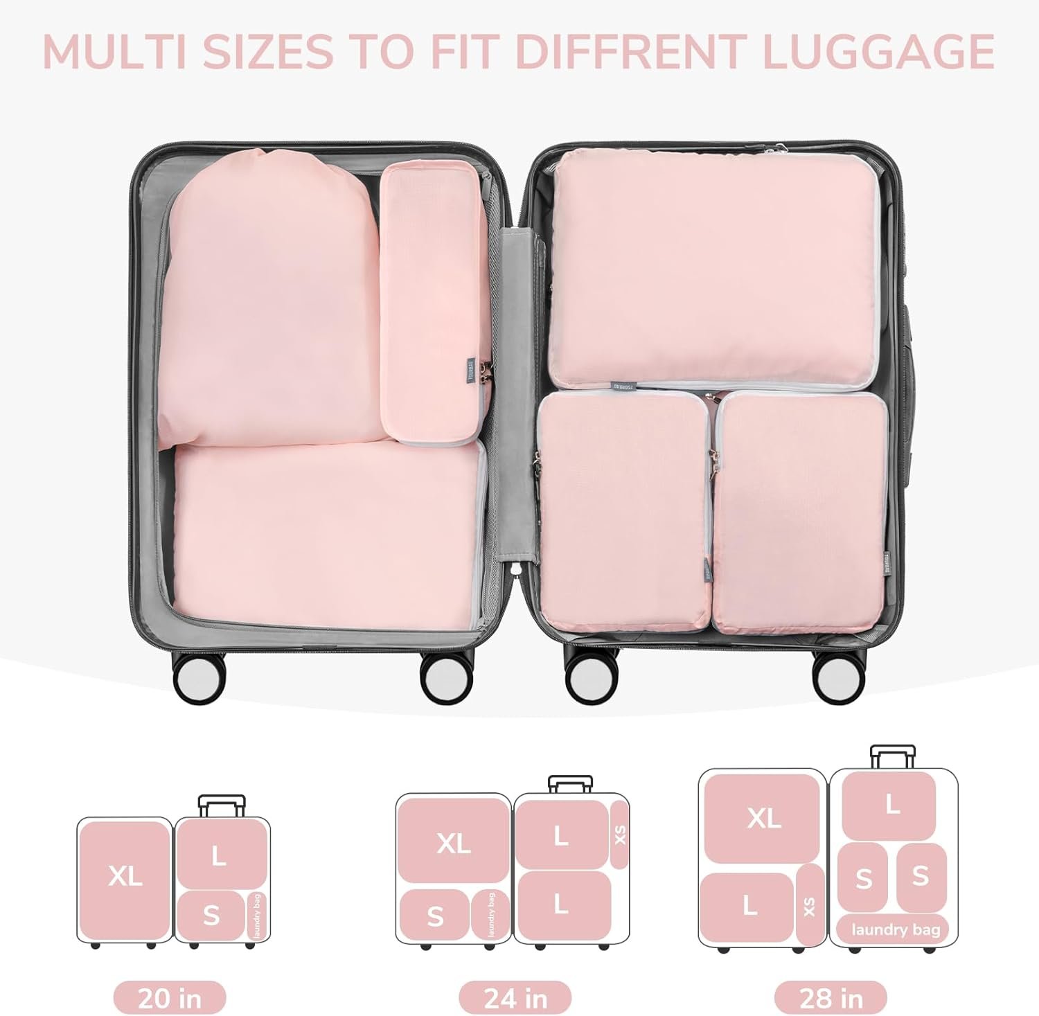 Different Sizes for Various Packing Needs: the XL cube (18.5×14.2×4.7 inches) is perfect for jackets and sweaters, two L cubes (14.5×11.0×4.7 inches) for shirts and swimwear, two S cubes (11.0×7.8×4.7 inches) for baby clothes and underwear, one XS cube (12.9×4.7×4.7 inches) for shoes, and a 14.1×20.0 inches laundry bag for dirty clothes