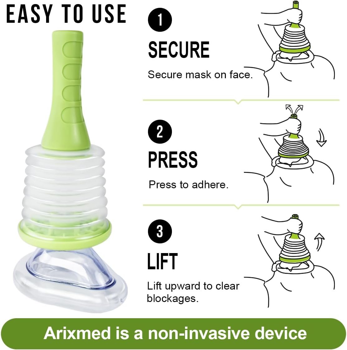 ArixMed Choking Rescue Device includes three masks – two adult masks (one for practical use, one for practice), one kid mask, and a practice manual – covering both adults and children. The practice mask ensures that users are familiar with its operation before an emergency occurs.