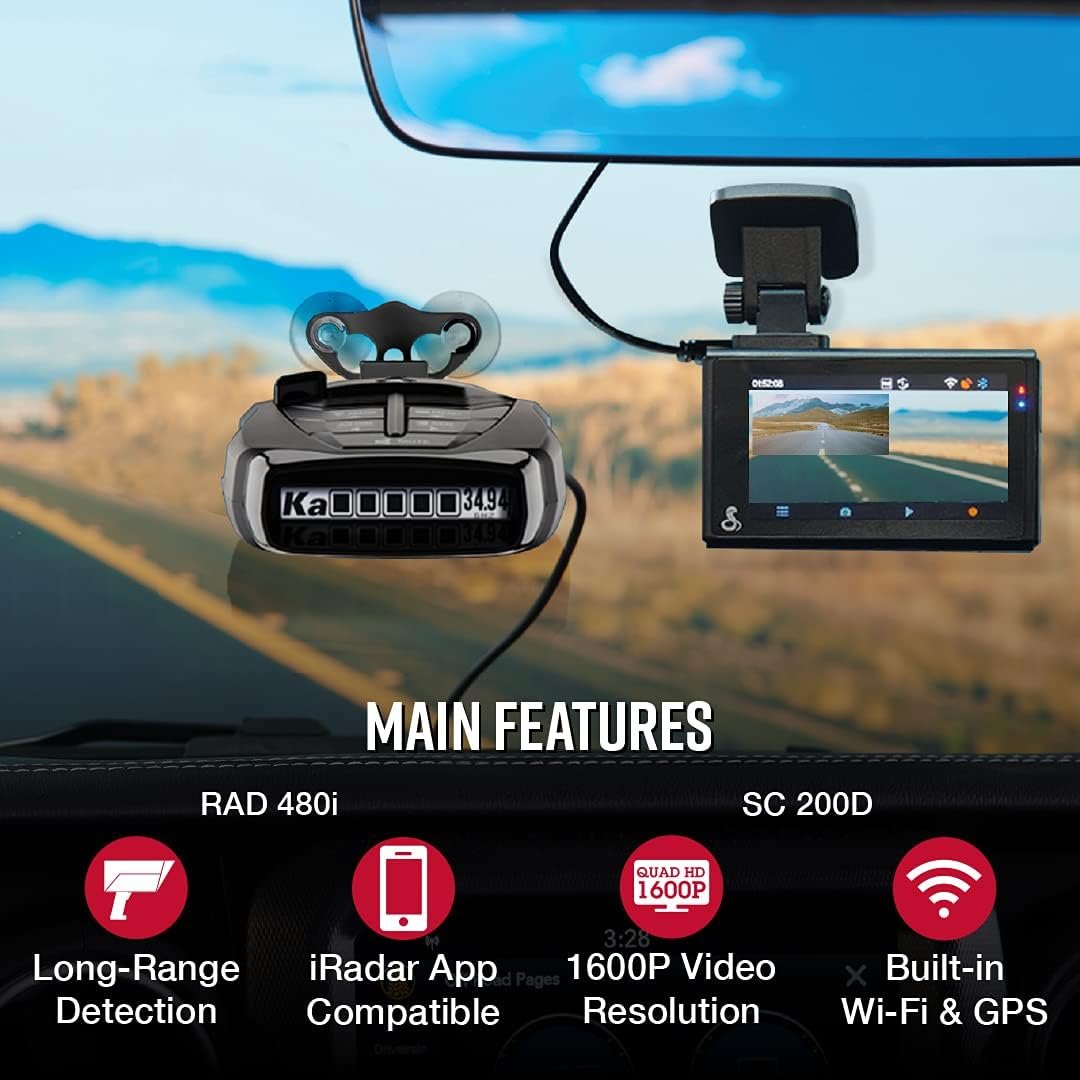 Cobra SC 200D Smart Dash Cam and RAD 480i Laser Radar Detector – QHD+ 1600P Video Recording, Voice Commands, Included Rear-View Cam, Bluetooth Connectivity, LaserEye Front and Rear Detection, Black