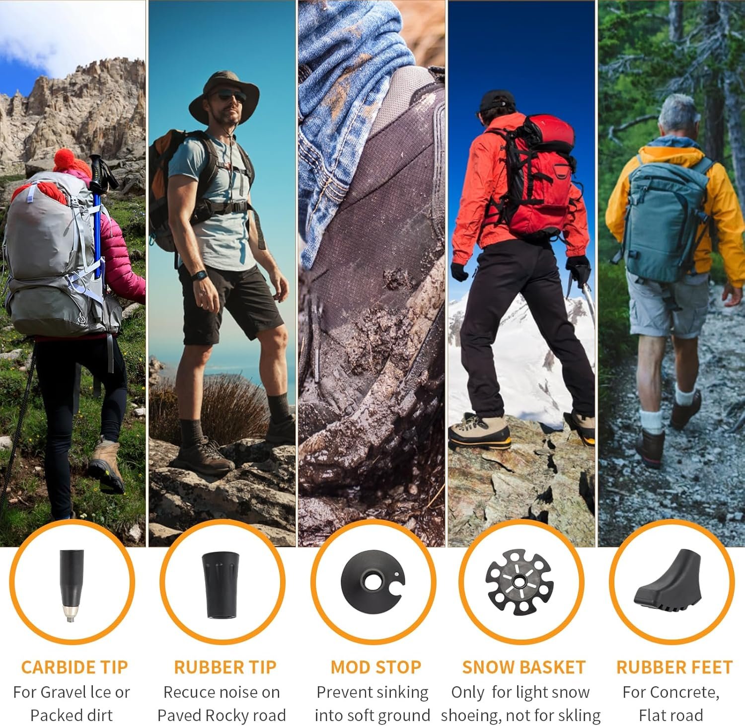 **All-Weather Durability**: Built to withstand the elements, our hiking poles feature a robust tungsten steel tip that excels against rocks, ice, and mud. To further enhance versatility, we include multi-functional rubber tips for varied surfaces, allowing you to tackle any terrain with confidence and making your outdoor explorations hassle-free.