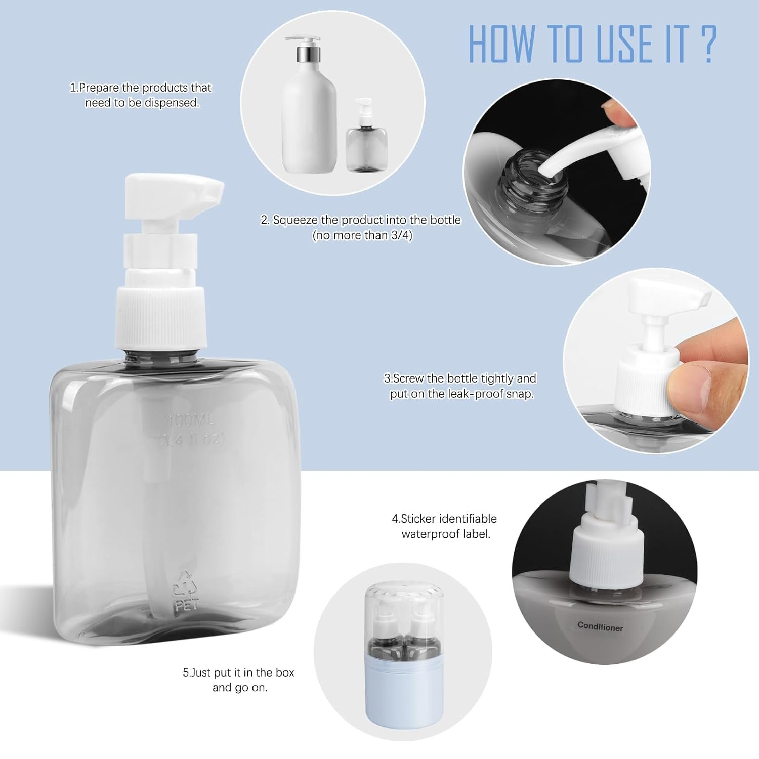 [Multifunctional Travel Bottle] Our travel toiletry containers can be used to store body wash, shampoo, conditioner, facial cleanser, lotion, hand sanitizer, gel, makeup remover, toner, disinfectant, moisturizing water, etc. Easy to press, good dosage control, avoid waste.