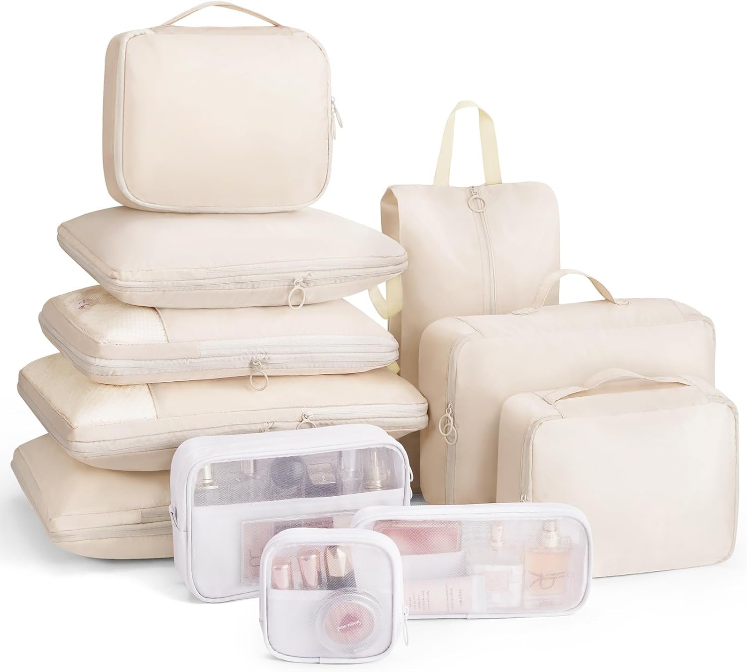 Compression Packing Cubes 11 Set, Suitcase Organizers, Luggage Organizer Bags for Storage, Extendable Packing Cubes for Travel Compression, Travel Essentials, Beige