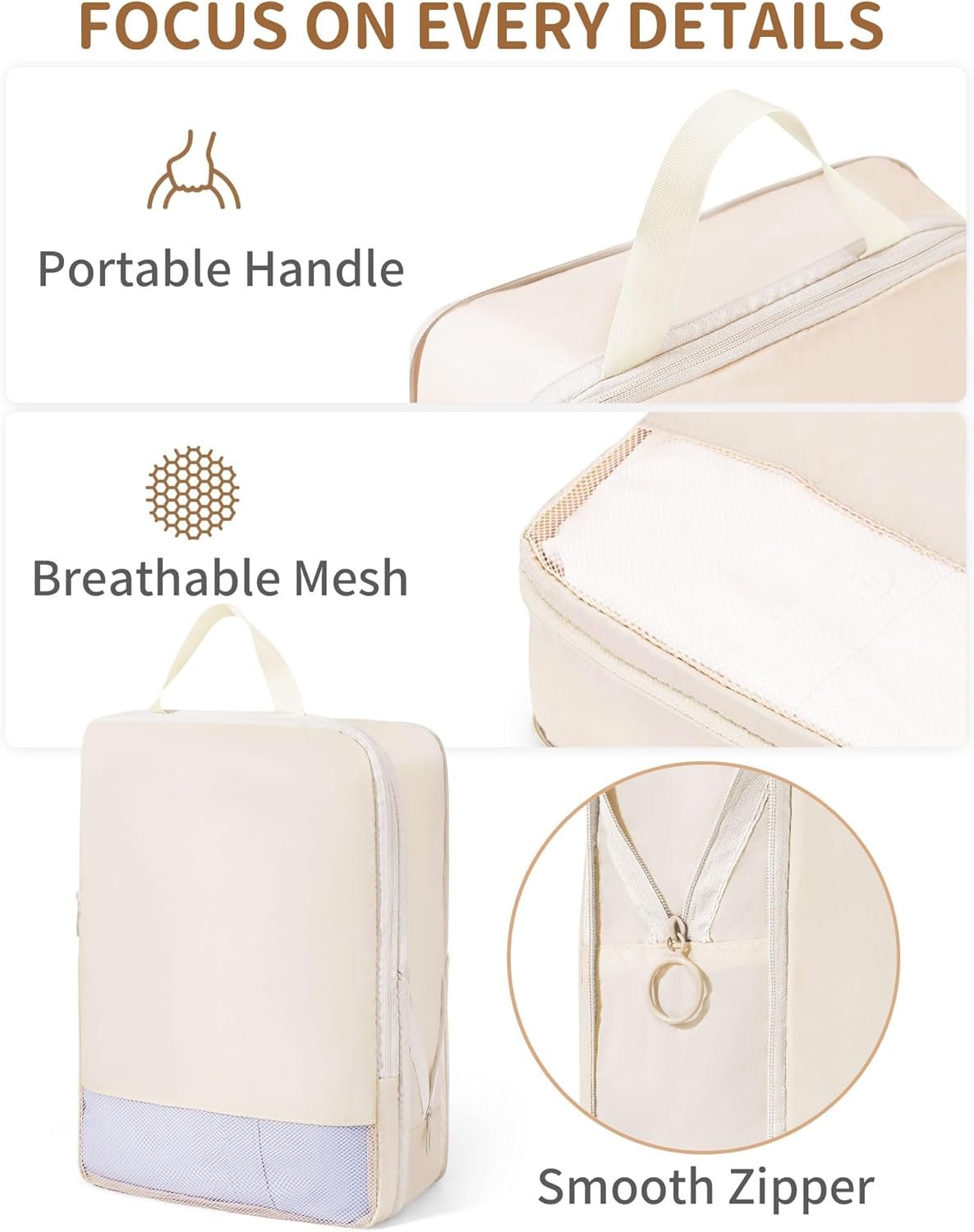 【SAVE 50% OF SPACE】Our Packing Cubes come equipped with an efficient ZIP compression system, saving you both SPACE and TIME when packing. The high compression rate allows 1 suitcase to fulfill the role of 2, and its high efficiency enables you to focus more on your journey.