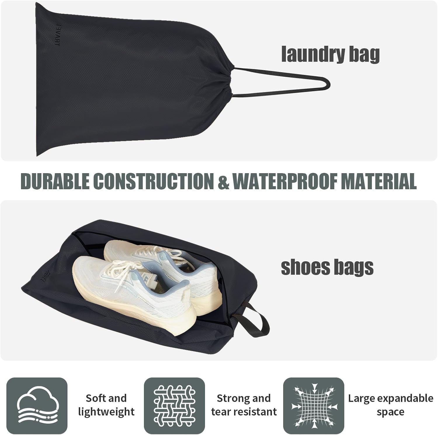 6 Sets of Packing Cubes: 1 large cube, 2 middle size cubes, 1 toiletry bag, 1 shoes bag, 1 laundry pouch. Fit clothes &carry-ons for two-week trip.