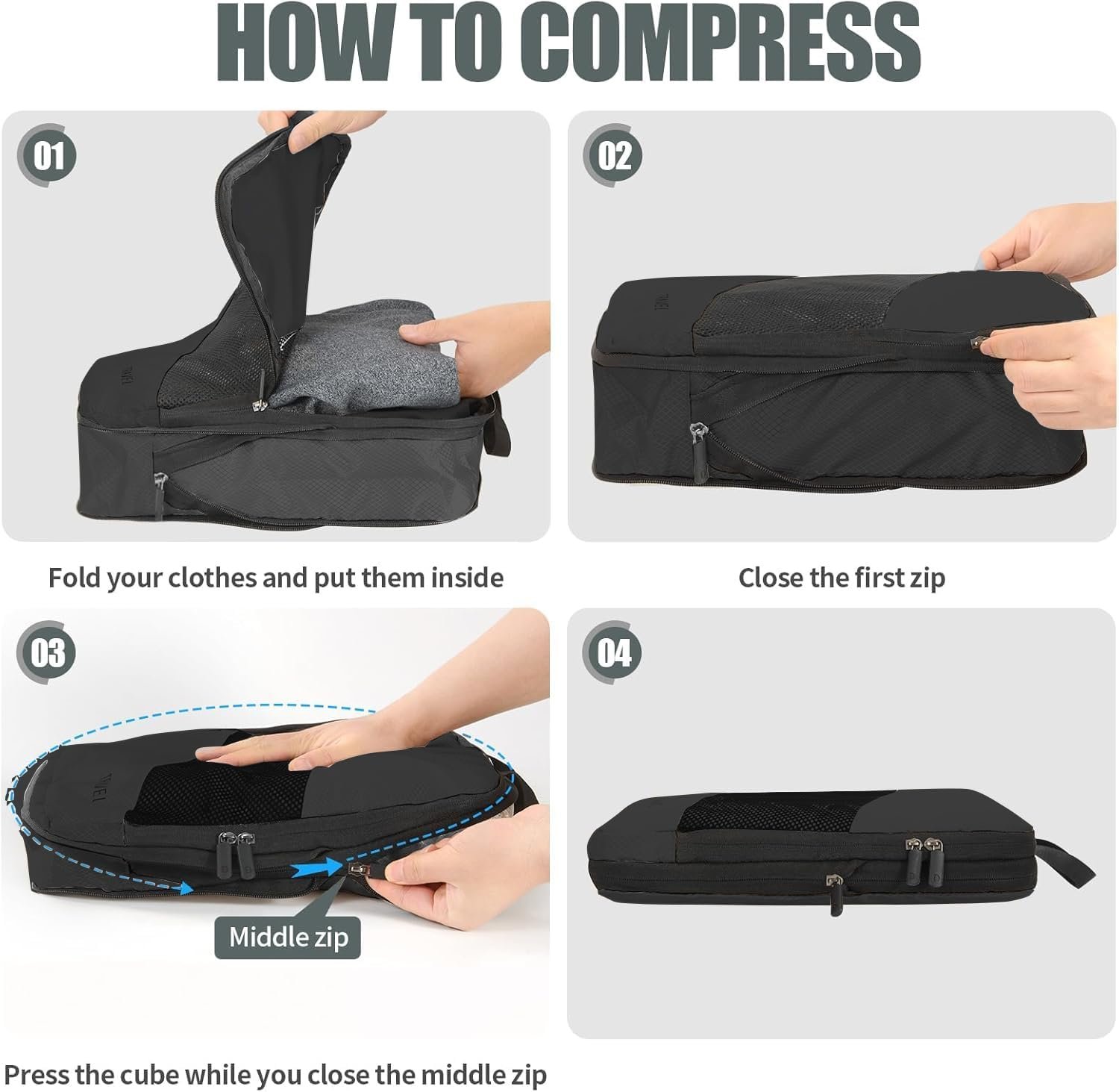 Space Saving Cubes: use the compression zip, it can save up to 30%-50% of your luggage space.