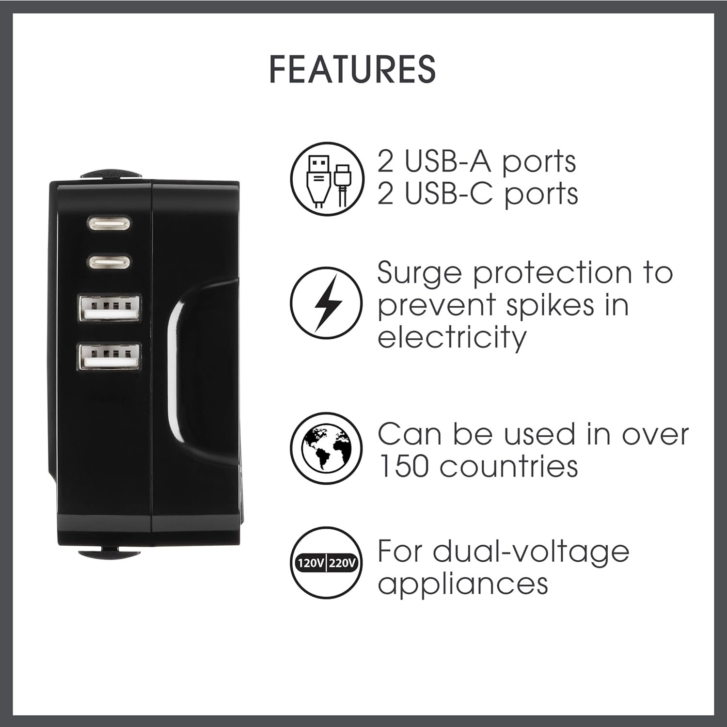 USB-C Charging: Includes 2 USB-A and 2 USB-C ports. Small and compact, perfect for traveling abroad. Keep your devices fully charged while traveling by charging multiple devices simultaneously.