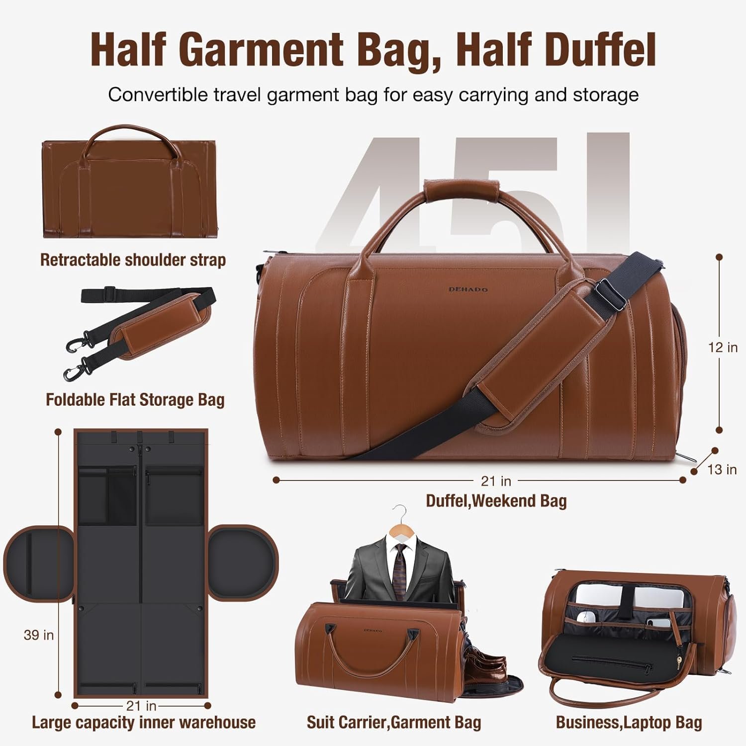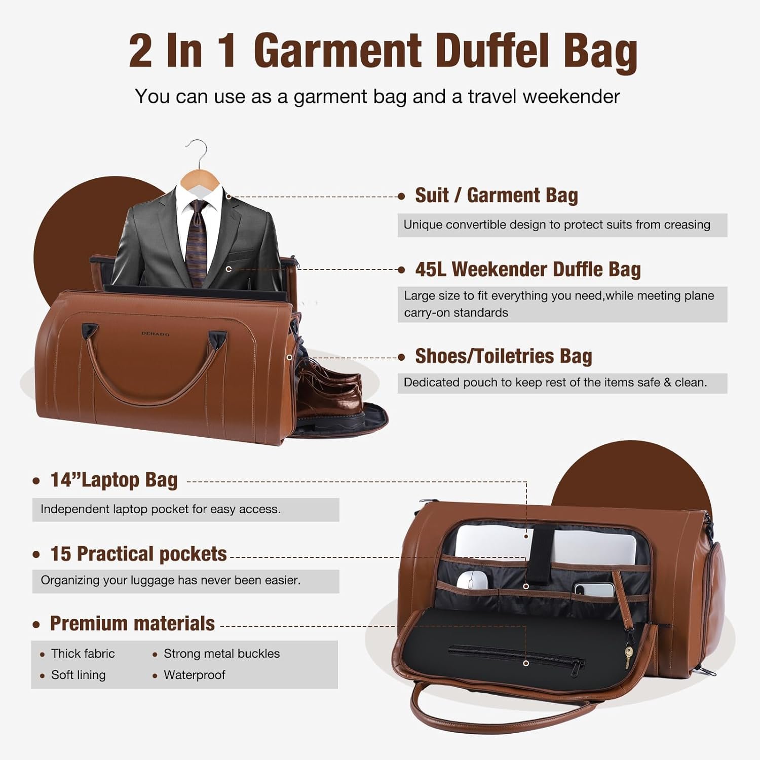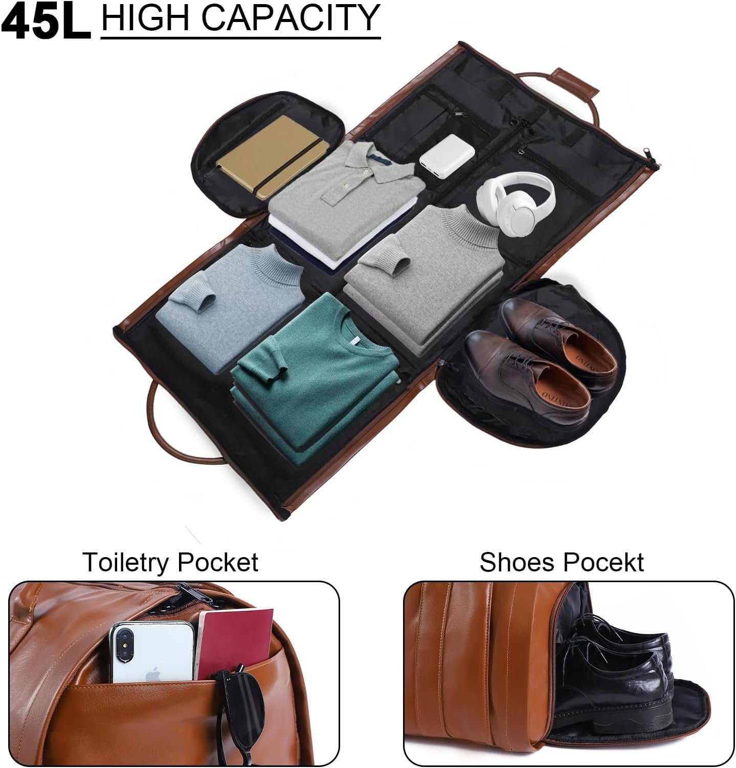 Convertible Garment Duffel Bag for Travel, For Men Women, 2 IN 1 Carry on Suit Bag with Shoulder Straps, PU Leather Overnight Bags with Shoes Compartment,14″ Laptop Compartment