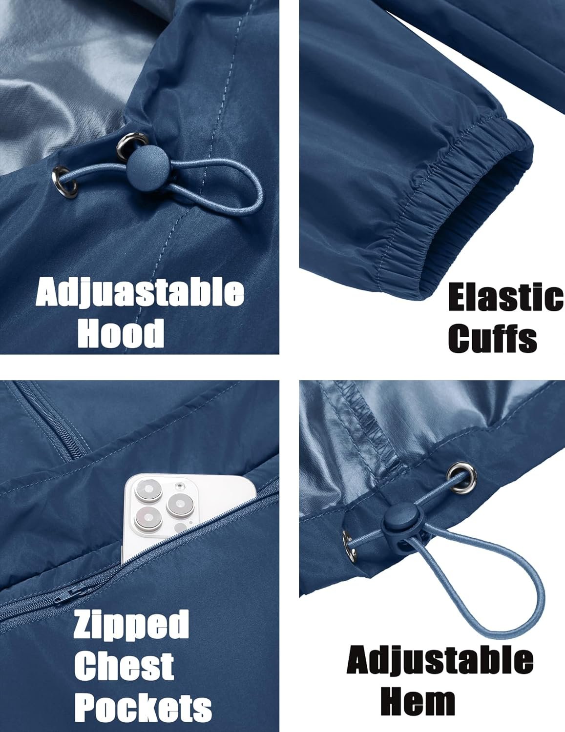 Men lightweight waterproof rain jacket features drawcord adjustable hood, large zippered front pocket and 2 side pockets are easy to carry and store various personal belongings. This lightweight packable is a great outdoor travel gear.