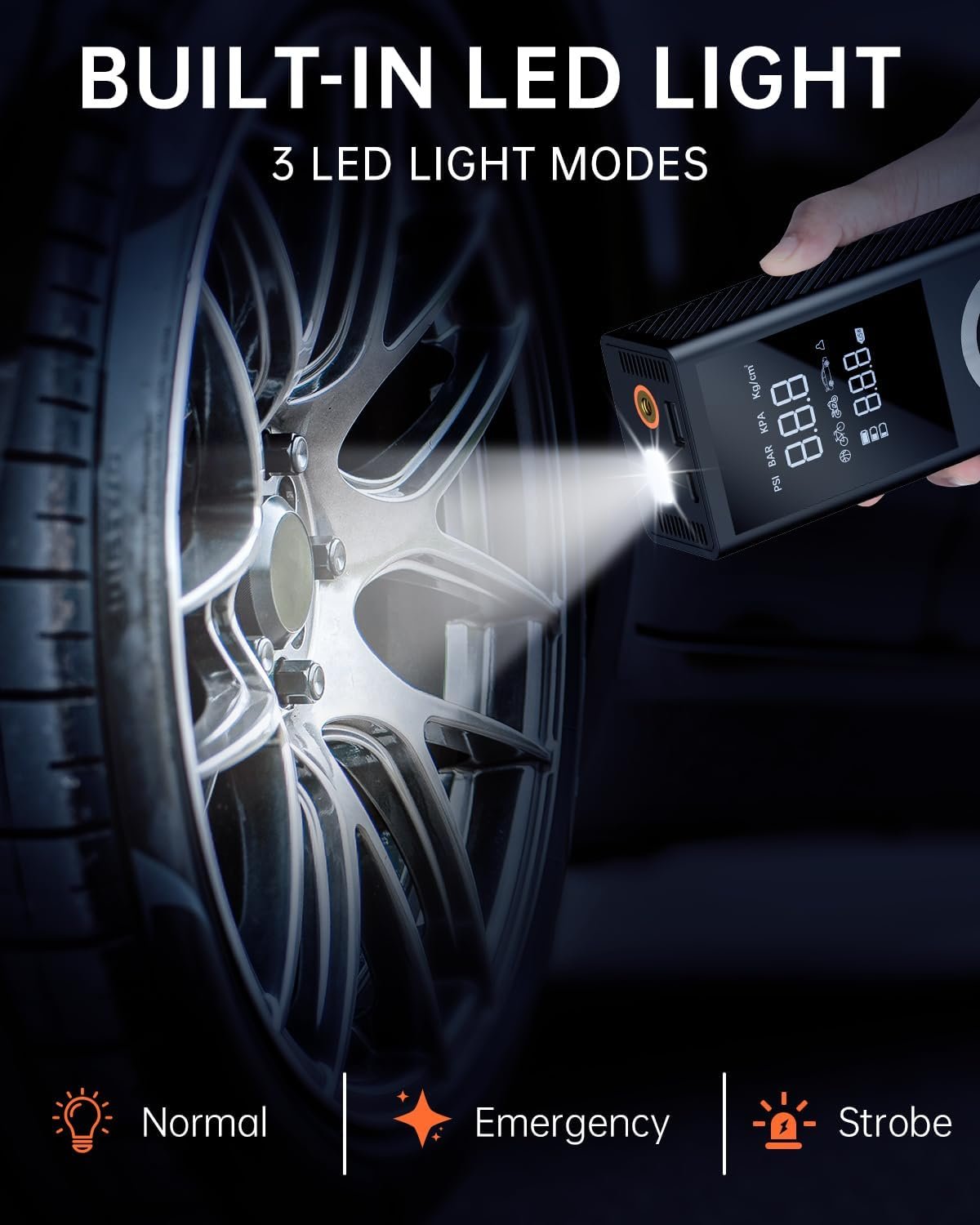 MULTIFUNCTIONAL EMERGENCY: This compact device is not just a portable air compressor but also a versatile emergency tool. It features an LED light for inflating in the dark, changing tires, or signaling other vehicles at night. Plus, with a C-type charging port and a 5V/2A USB output port, it can double as an emergency power source for your electronic devices.