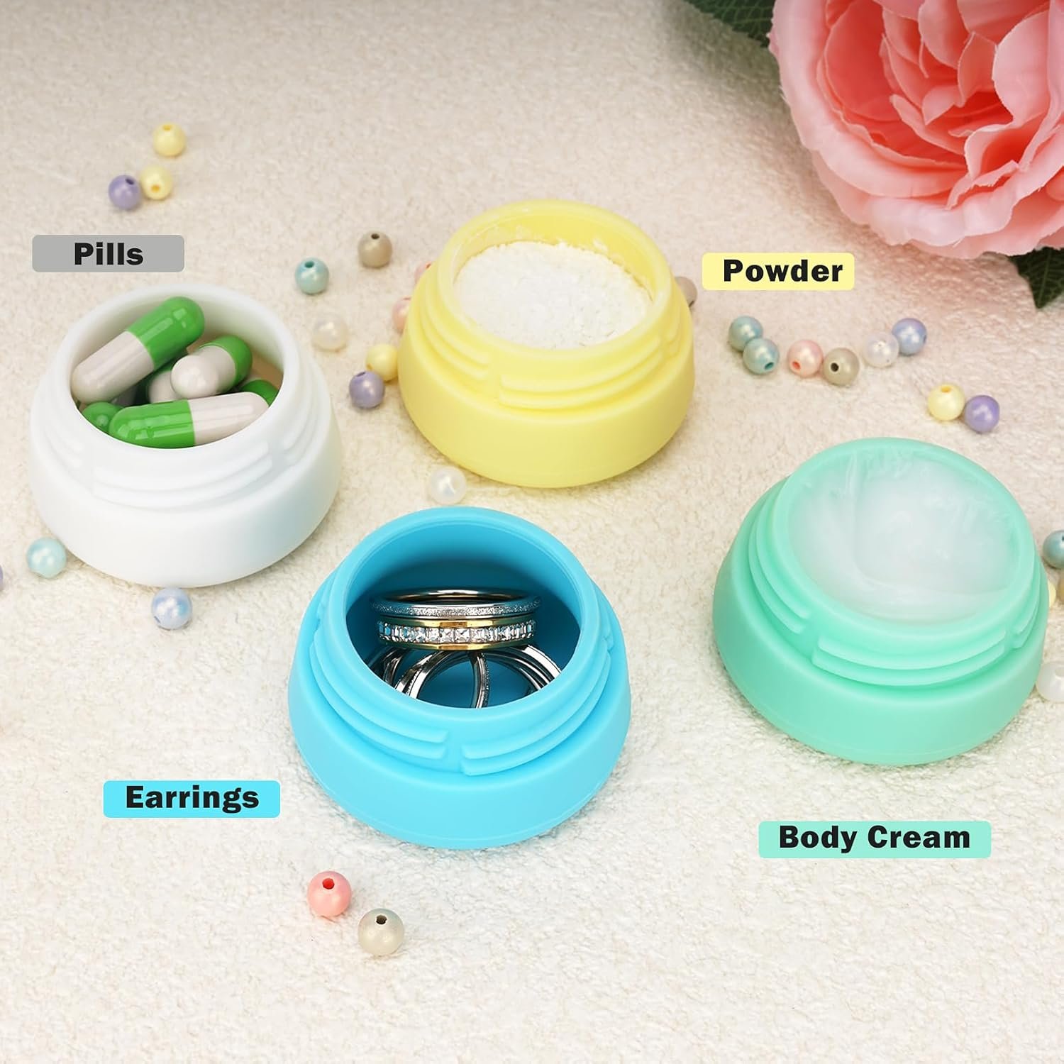 Multi-uses Travel Cream Jars: These travel jars for creams can not only store various lotions, cosmetics, shampoos, powders and creams, but also pills, small earrings, necklaces and other accessories. They can meet your various daily storage needs.