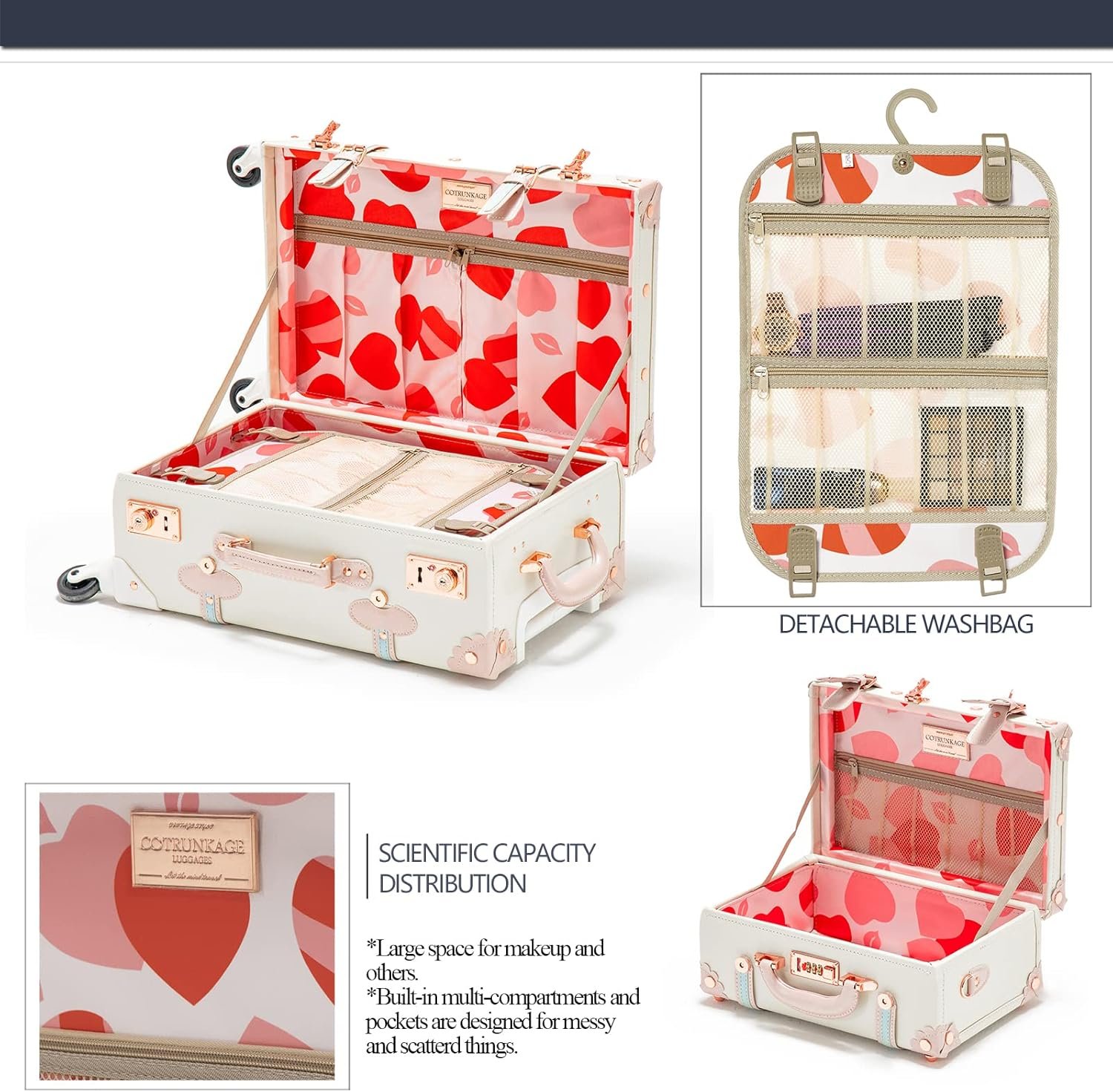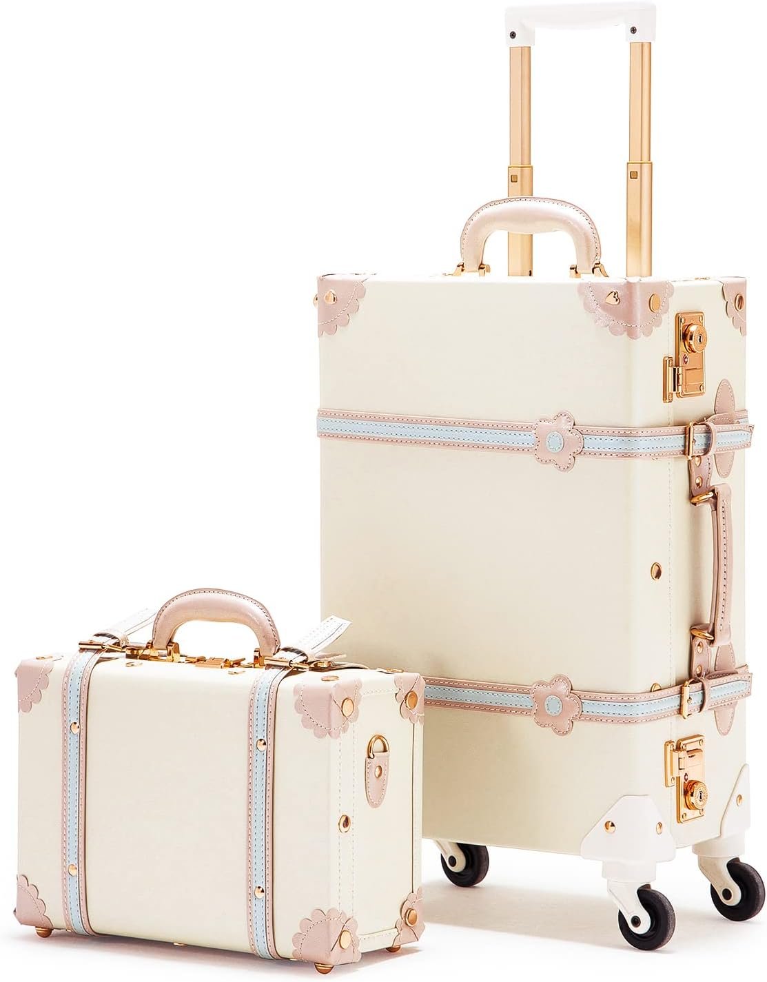 COTRUNKAGE Vintage Suitcases Set on Wheels, 20 Inch White Carry-on Luggage 2 Piece Set with 13″ Hard Shell Train Case Womens, Cream White
