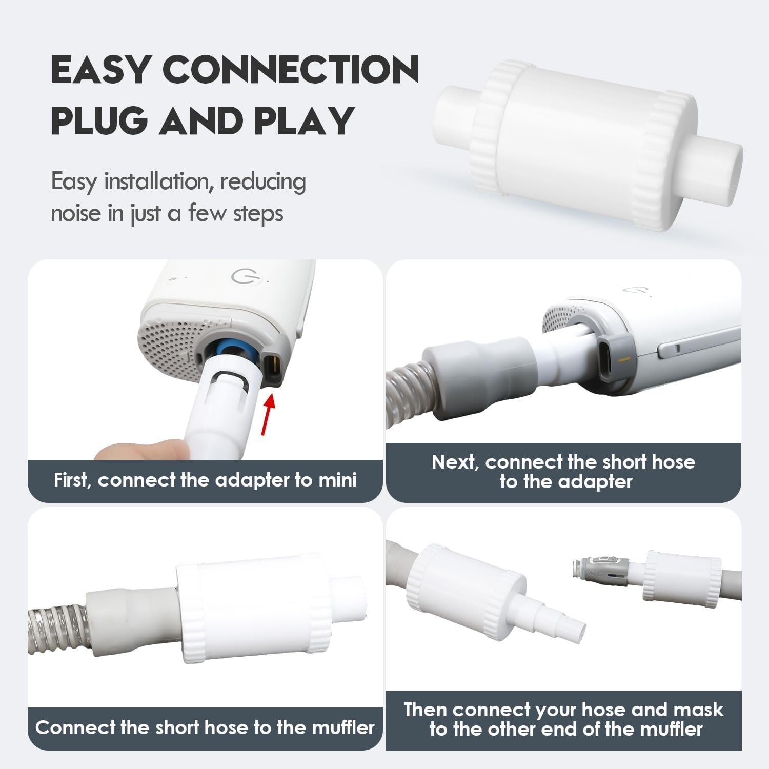 EASY CONNECTION: Easy to use, it was plug and play with your hose. Muffler and connection adapters are a good solution to adapt the flexibility of old cpap masks and hoses to the new airmini device