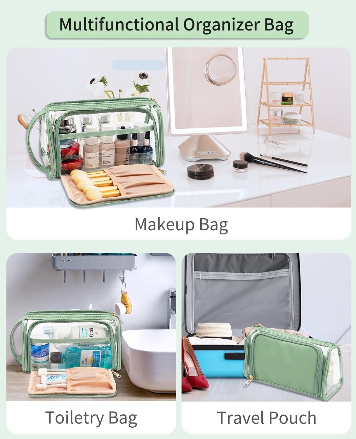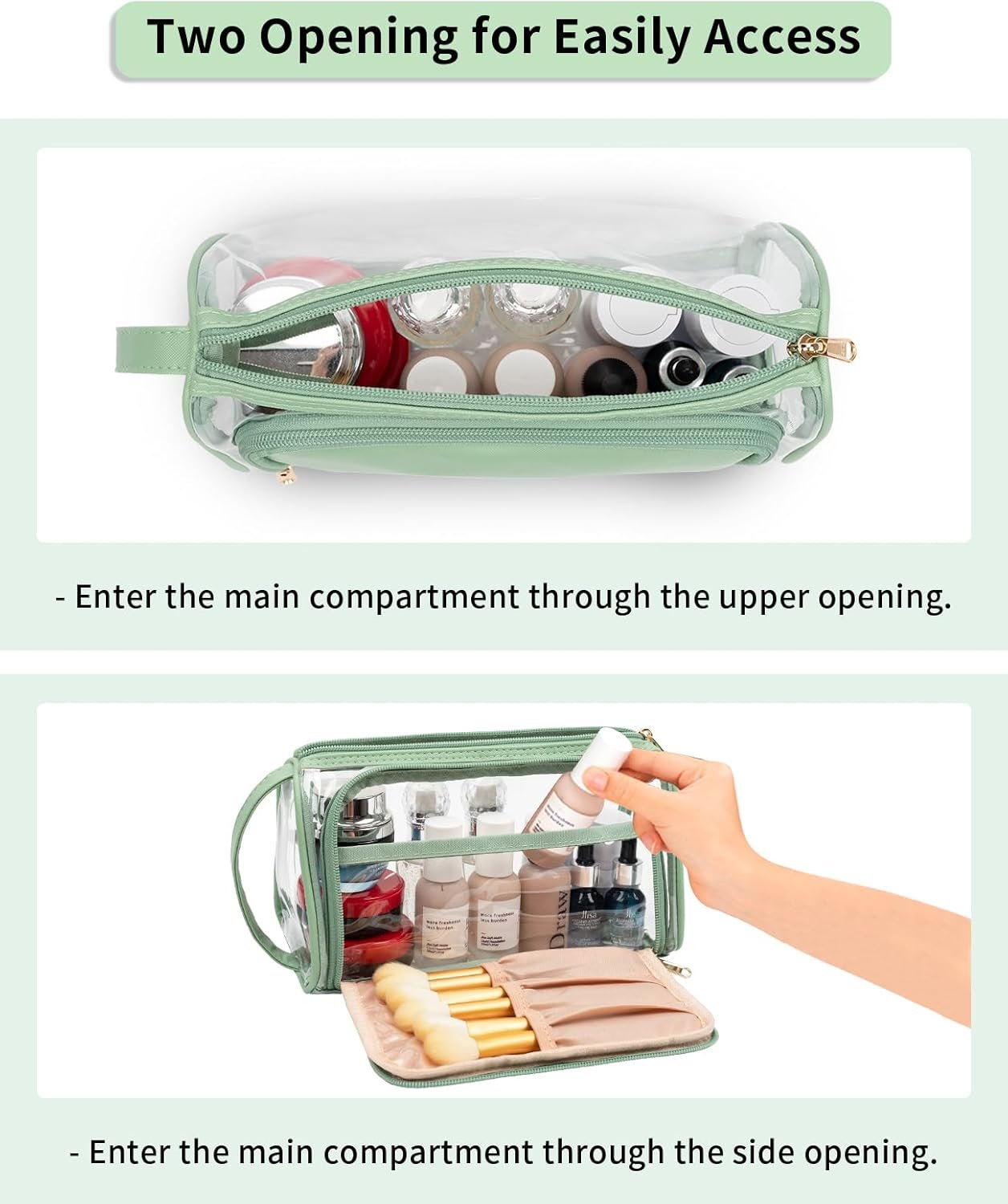 ☑ TWO WAYS OPEN – This clear travel bag has two zippers, one on the top and the other one in the front. The duel openings make this makeup organizer bag easy to pack, use and clean. You can see everything in the bag from the front zipper opening section and easy to access.