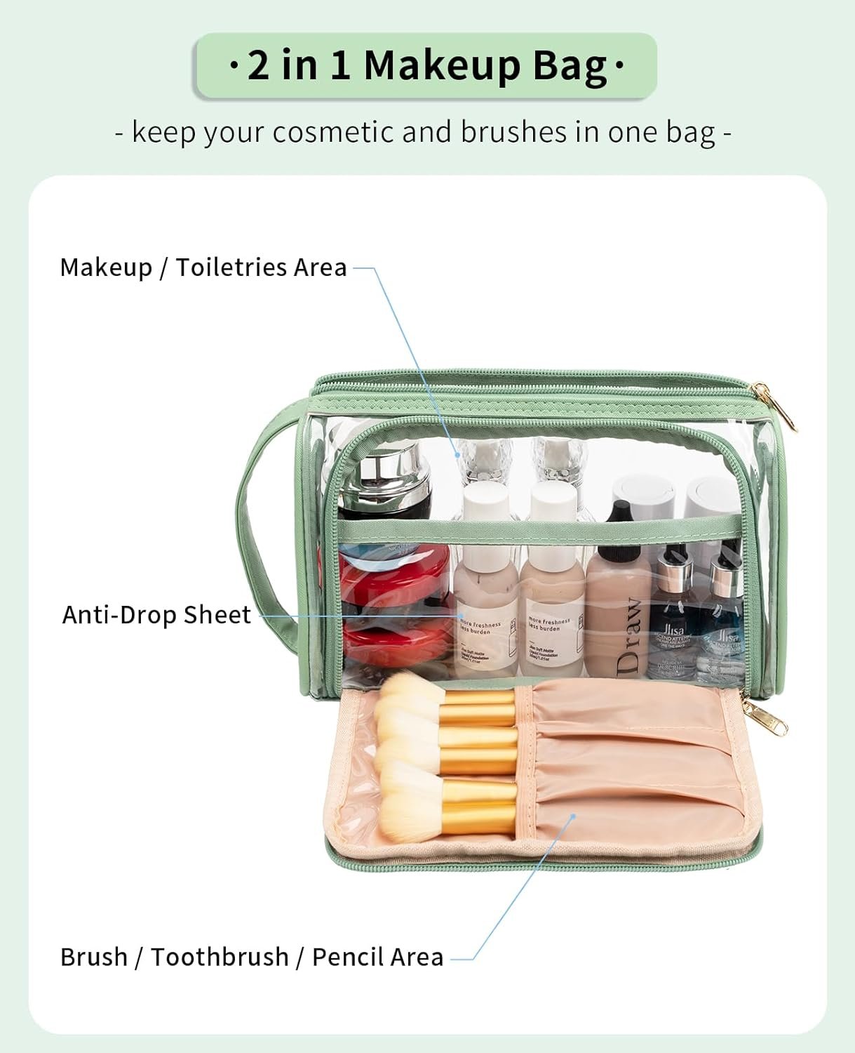 ☑ HIGH QUALITY – This makeup bag for purse is made of PU leather and clear PVC. No bad plastic chemical scent. The mental zipper is made from SBS manufacturer, which is very reliable and durable. Not easily break.