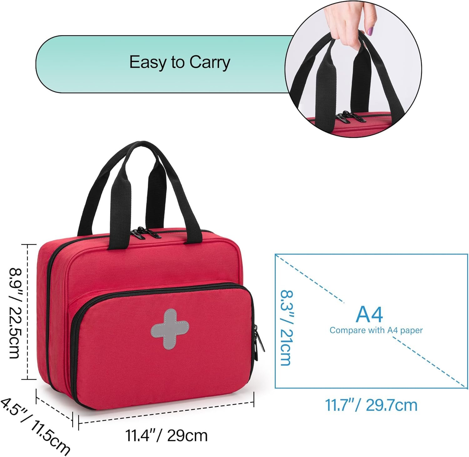 Transparent zipper pouch great for carrying medication, masks, etc.Main compartment comtains different elastic bands and mesh pockets to hold alcohol, pills, small scissors, haemostat and other medical supplies.