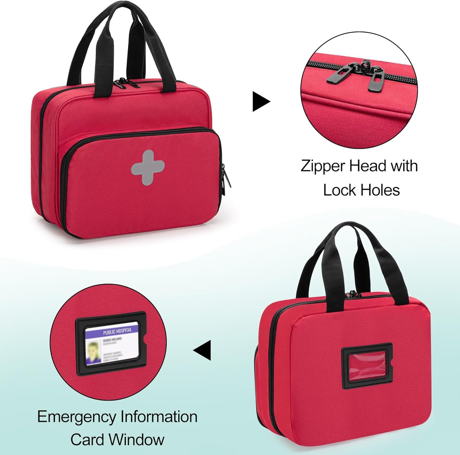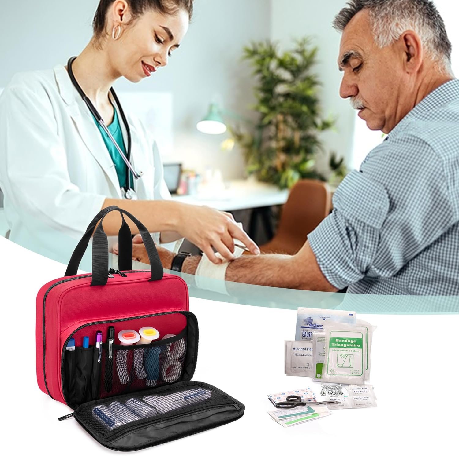 [Excellent Storage] The main compartment has a flip cover pocket, the other mesh pockets are suitable for carrying alcohol, pills, small scissors, hemostat. Front compartment with 2 mesh pockets and slots for storing bandages, medical records, and so on.