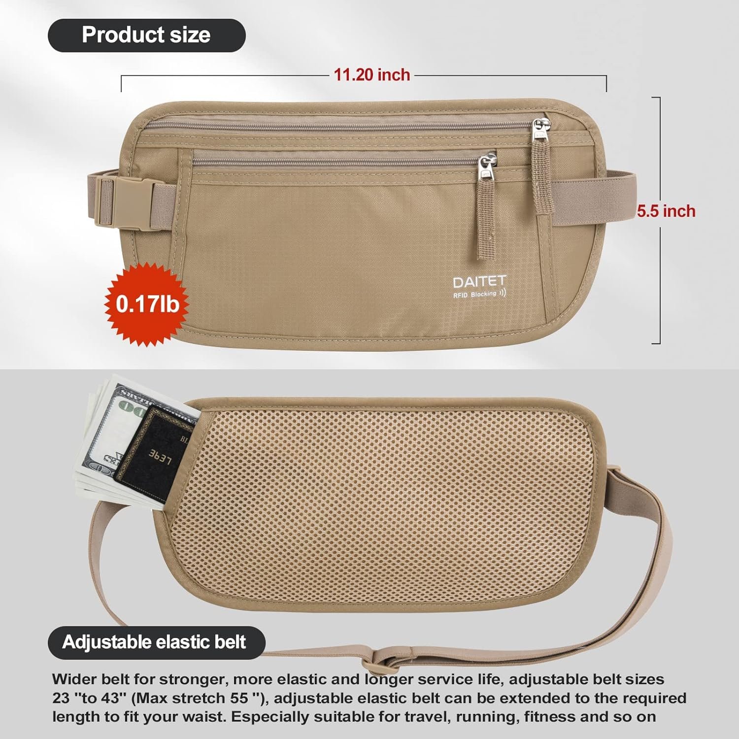 DAITET Money Belt – Passport Holder Secure Hidden Travel Wallet with RFID Blocking, Undercover Fanny Pack (Beige)