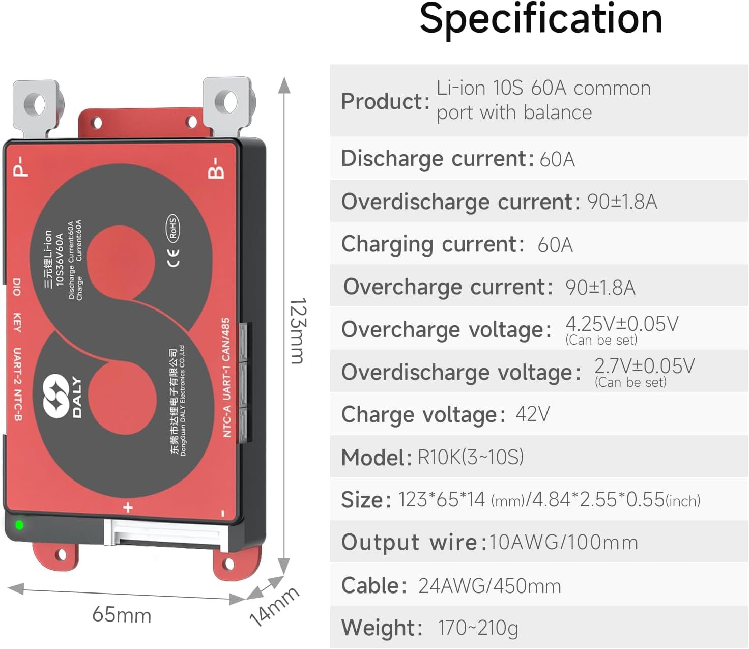 DALY Smart 10S BMS 36V 60A with WiFi Module and CAN 485 Communication Protection Board for Li-ion Lithium Battery Pack(Li-ion 10S 36V,60A)