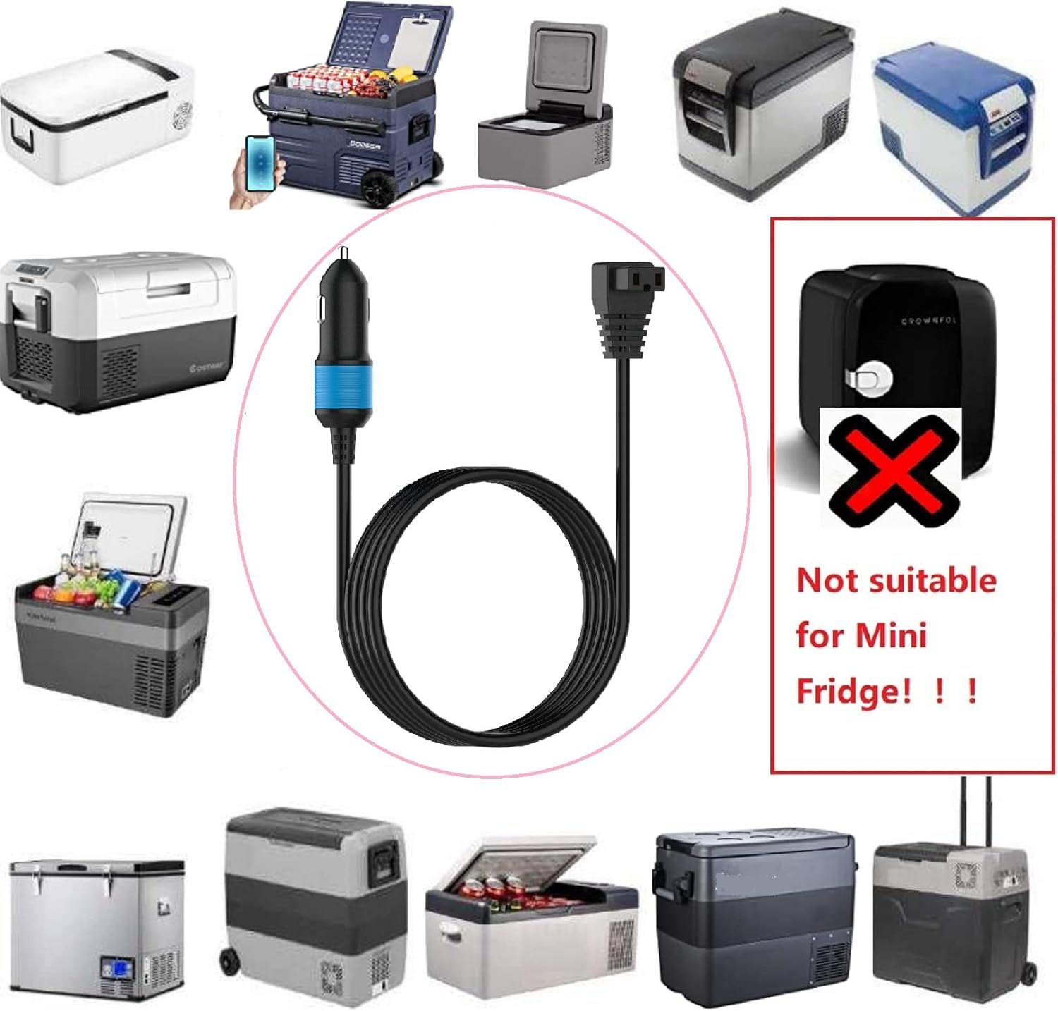 ☀ SOME NOTICES ▶ This Power Cable is not used for all Car Fridge and Car Cooler (PLEASE DO NOT USE IN MINI FRIDGE). Before Purchasing, Please Confirm whether it Conforms to your Refrigerator Power Socket.