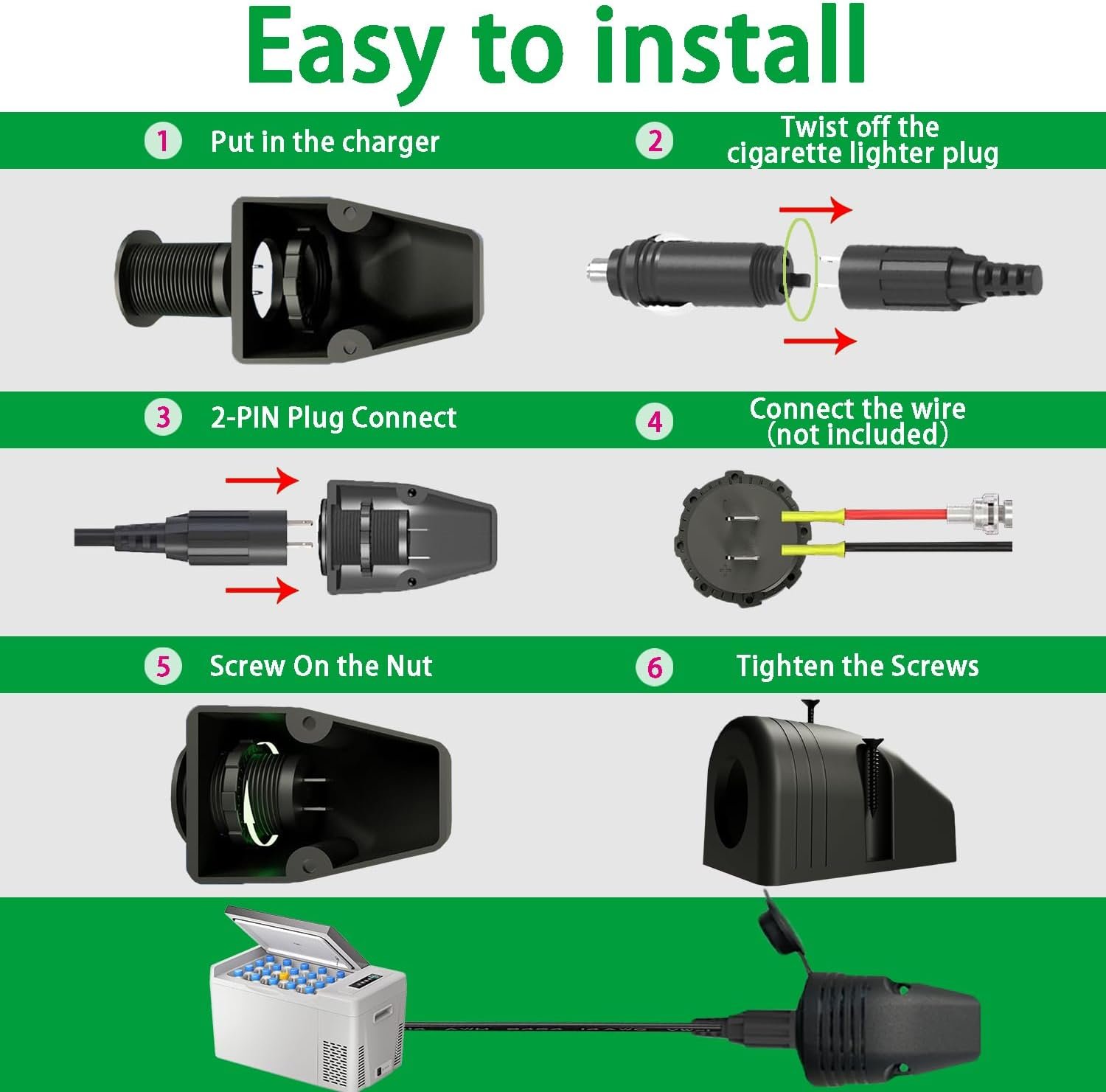 【MORE RELIABLE CONNECTION】: Perfect for RVs, campers, truck cabs, cars, SUVs,Keep your refrigerator powered for a long time without falling off,No matter how rough the road may be not easy to loosen, keeping the car refrigerator in working condition. For the more adventurous 4WD owner who wants to minimize the voltage drop in the electrical connection. This means you can install an extra 12V outlet at the rear of the car, SUV or pick up, near 12V accessories, shorten the DC lead, and have a secure plug when traversing corrugated roads, the cigarette plug tip can be removed and the special two pin plug can be screwed into the matching AR-b power socket for a secure connection.