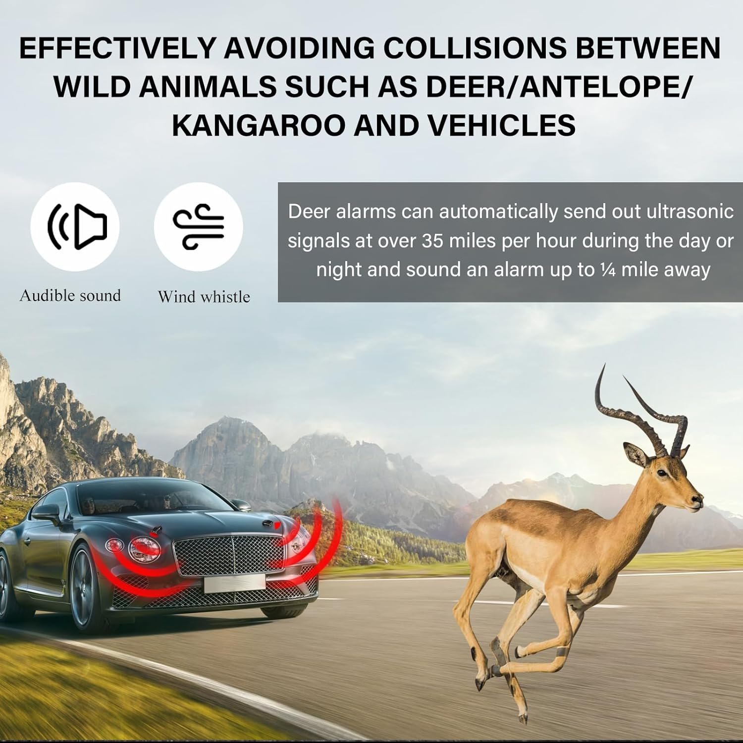 【Wind Driven Whistles】: These car deer whistles are wind-powered and require no electricity. When the car is moving, the wind causes the deer whistles to emit an ultrasonic wave that travels at speeds of more than 35 miles per hour and sends an alert 1/4 mile away.