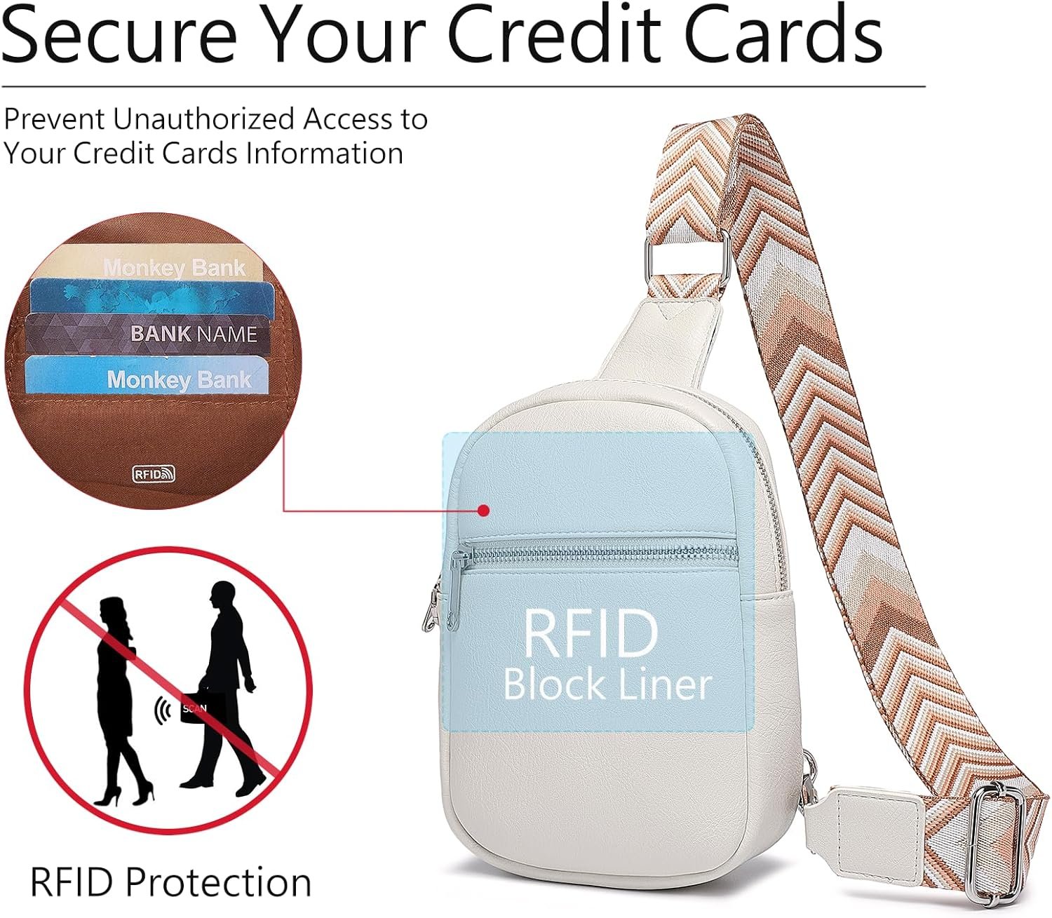 RFID PROTECTION: Featuring an RFID blocking liner, this small sling bag safeguards your cards, driver’s licenses, IDs, and personal information from unauthorized scans, whether you’re traveling, shopping, or daily use
