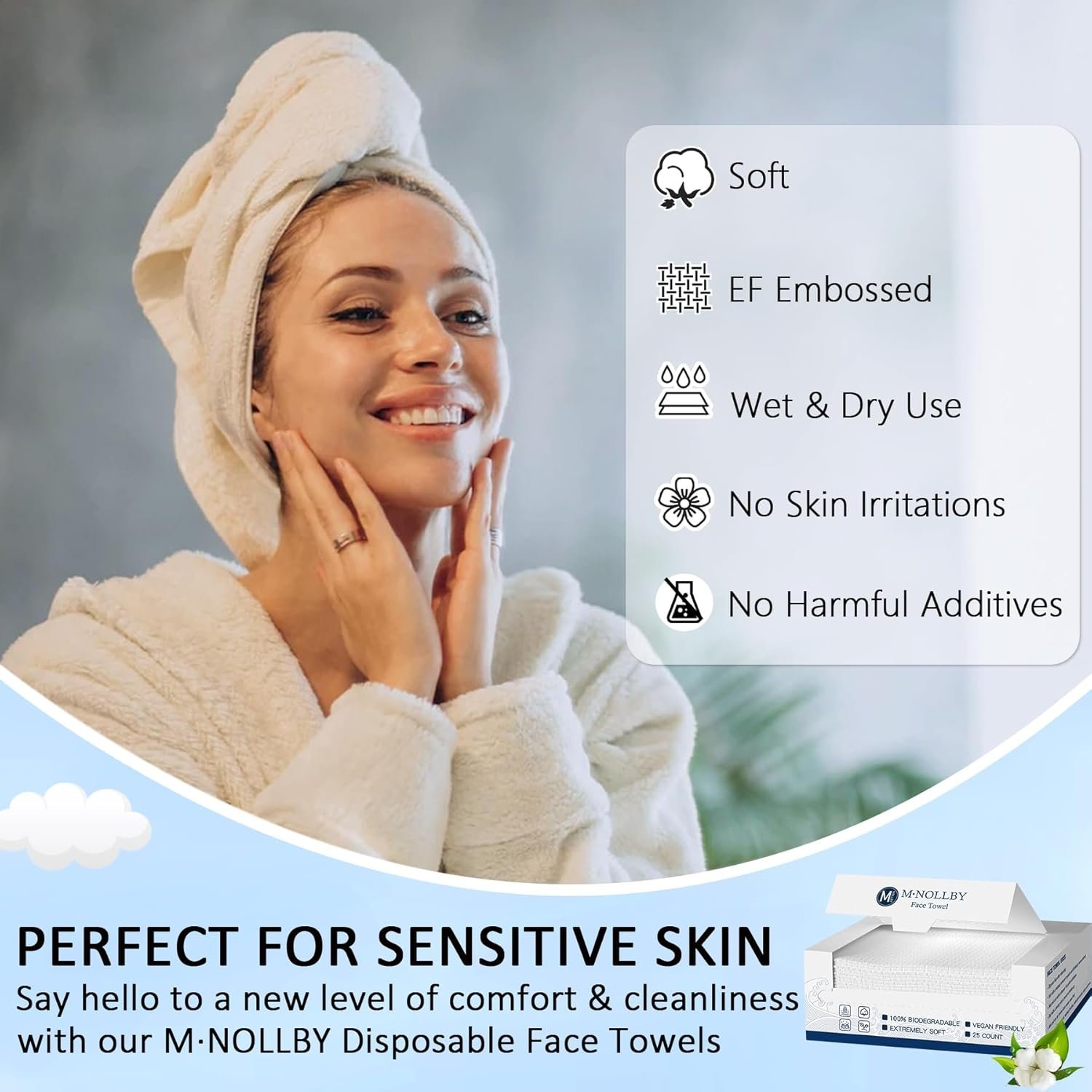 M·NOLLBY believe that taking care of your skin should never come at the cost of harming the environment. That’s why our disposable face towels are eco-friendly and sustainable, reducing your carbon footprint with every use. Unlike traditional towels, which require washing and drying, our face towels can be used once and then disposed of, making them the perfect choice for anyone who wants to protect the environment without sacrificing their skincare routine.